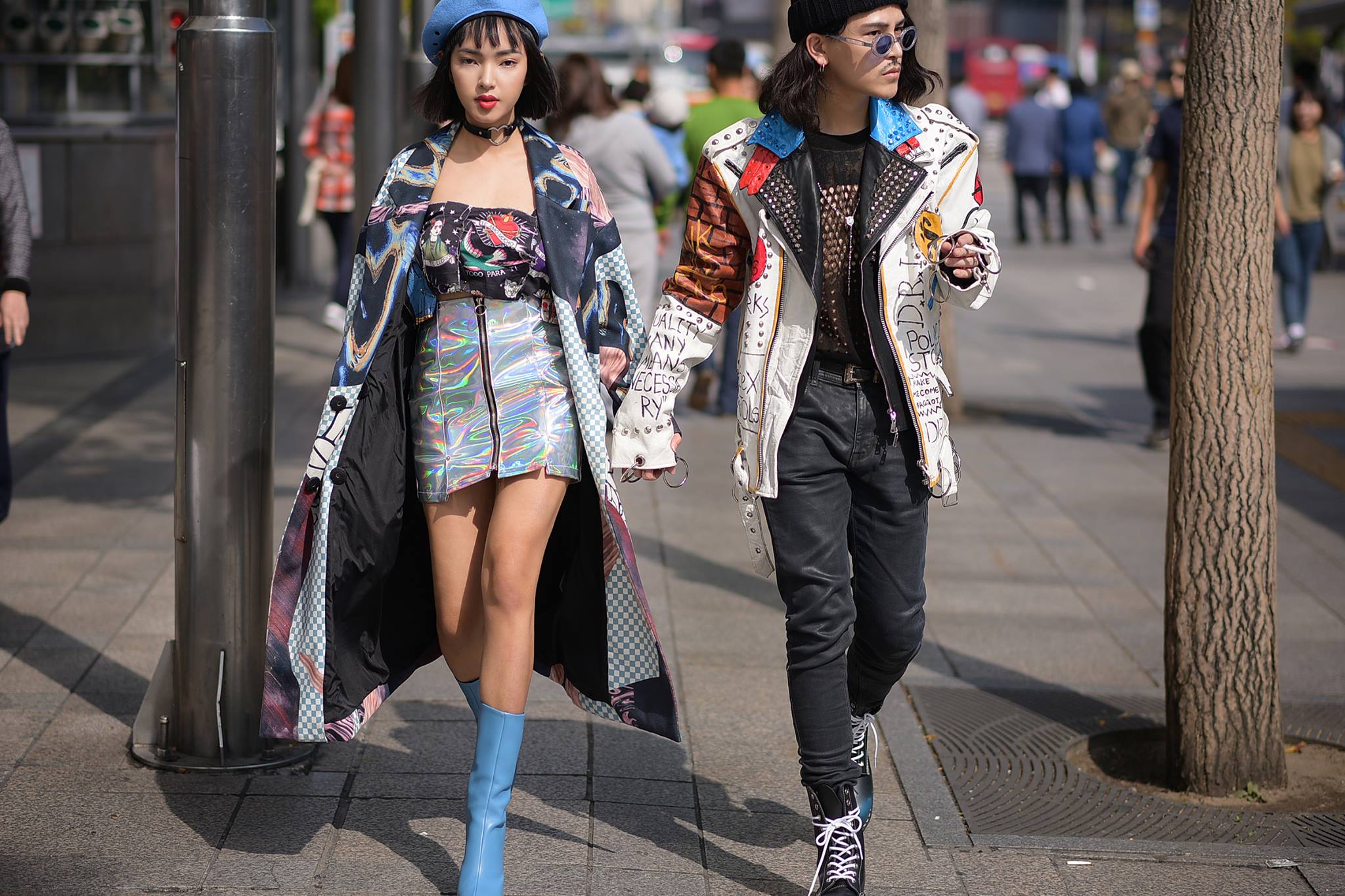 Cách ăn diện màu sắc cũng là một trong những nét đặc trưng của cặp đôi này. Cùng sử dụng gam màu xanh cobalt làm điểm nhấn, trong khi Châu Bùi thể hiện nét thời thượng qua mũ nồi và boots cao cổ thì Decao chỉ sử dụng một ít màu xanh ở phần ve cổ áo khoác, vẫn nổi bật nhưng vẫn giữ được nét nam tính.