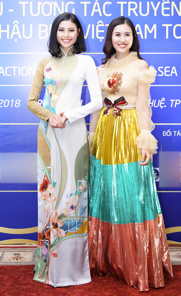 Đào Thị Hà xinh đẹp nổi bật khi diện trang phục áo dài lấy họa tiết hoa sen làm cảm hứng trang trí, bên cạnh cô là Hà Lade rực rỡ với váy áo hiện đại.