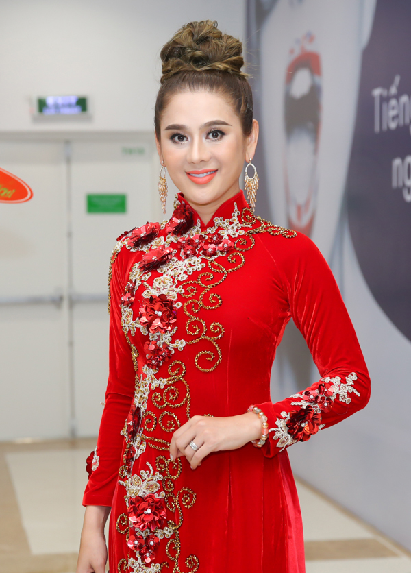 Cô dâu mới Lâm Khánh Chi trong sự kiện ra mắt phim cũng diện bộ áo dài đỏ rực rỡ, thêu hoa cầu kì.