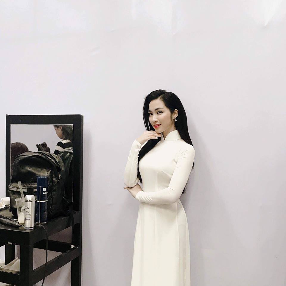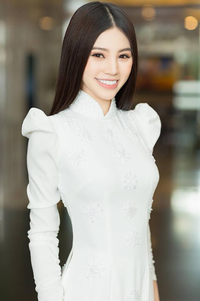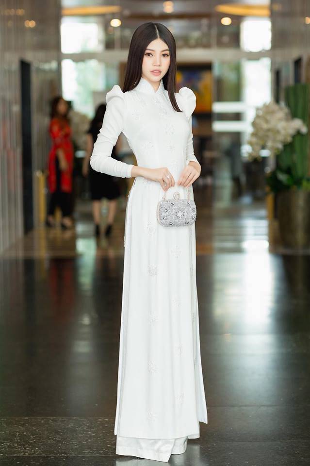 Khánh My cũng chọn áo dài trắng cổ tròn để tôn lên vẻ đẹp thướt tha của mình. Người đẹp để tóc suôn thẳng lộ ra gương mặt xinh đẹp không tì vết,