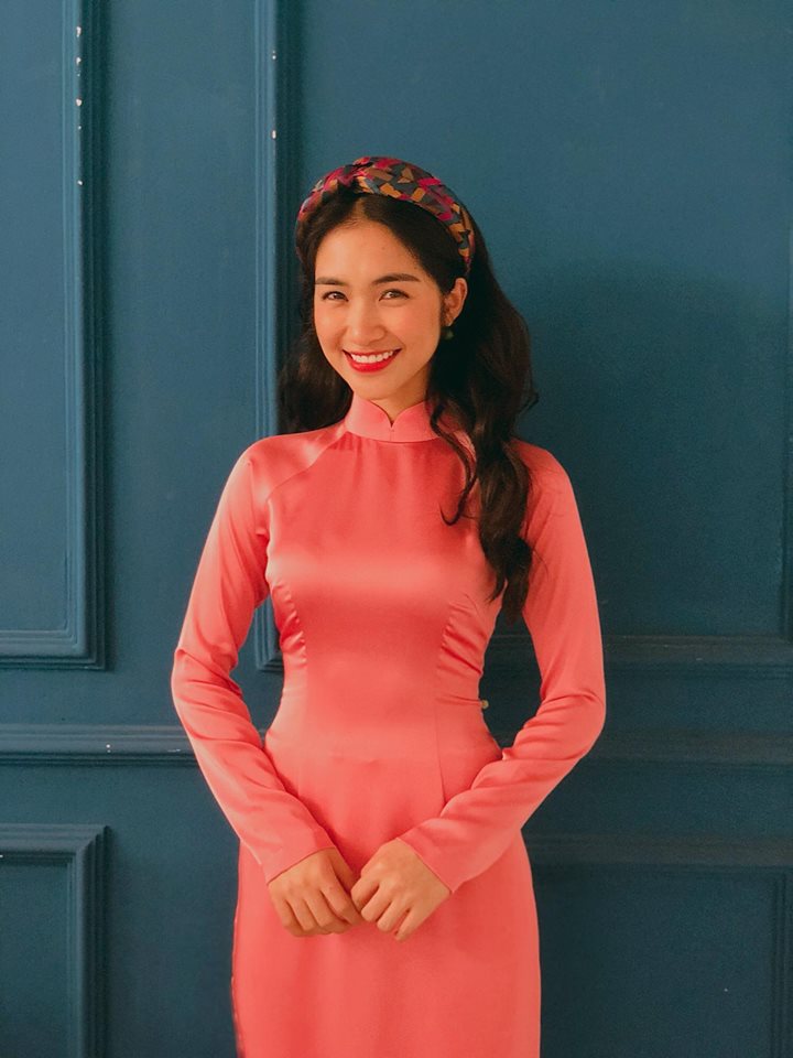 Áo dài hồng pastel giúp cô nàng trở nên tươi trẻ, rạng rỡ hơn.