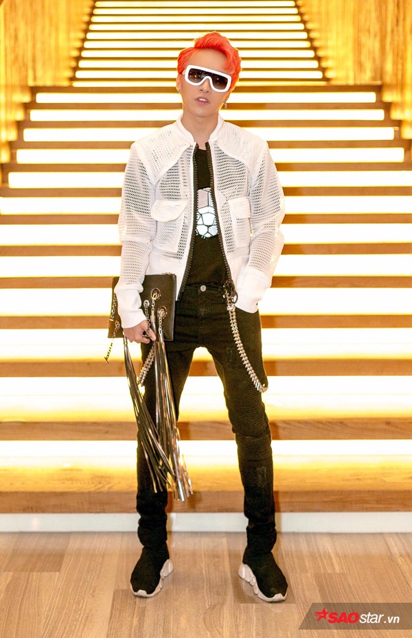 Stylist Kye Nguyễn chất chơi vô đối với mái tóc nhuộm đỏ cùng mắt kính robot gọng trắng tông xuyệt tông với áo khoác lưới. Clucth cầm tay từ thương hiệu Liusince 2010. Đôi giày sneaker thương hiệu Balenciaga - món đồ hot trend của giới trẻ được anh nhanh tay tậu.