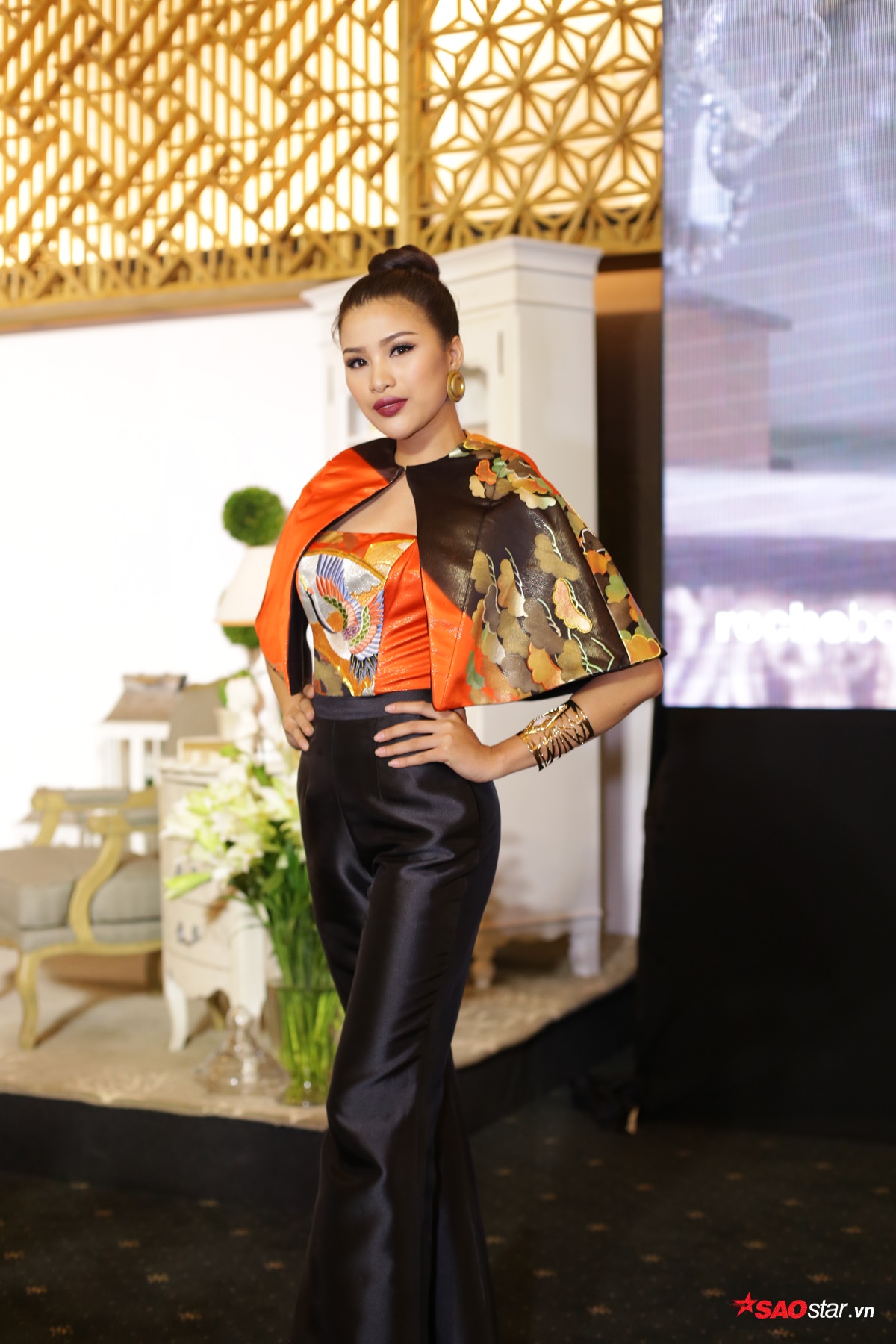 Cô diện trang phục nổi bật với chiếc áo mang đậm họa tiết Á đông và kiểu tóc búi củ tỏi cao khoe nét mặt thanh tú.