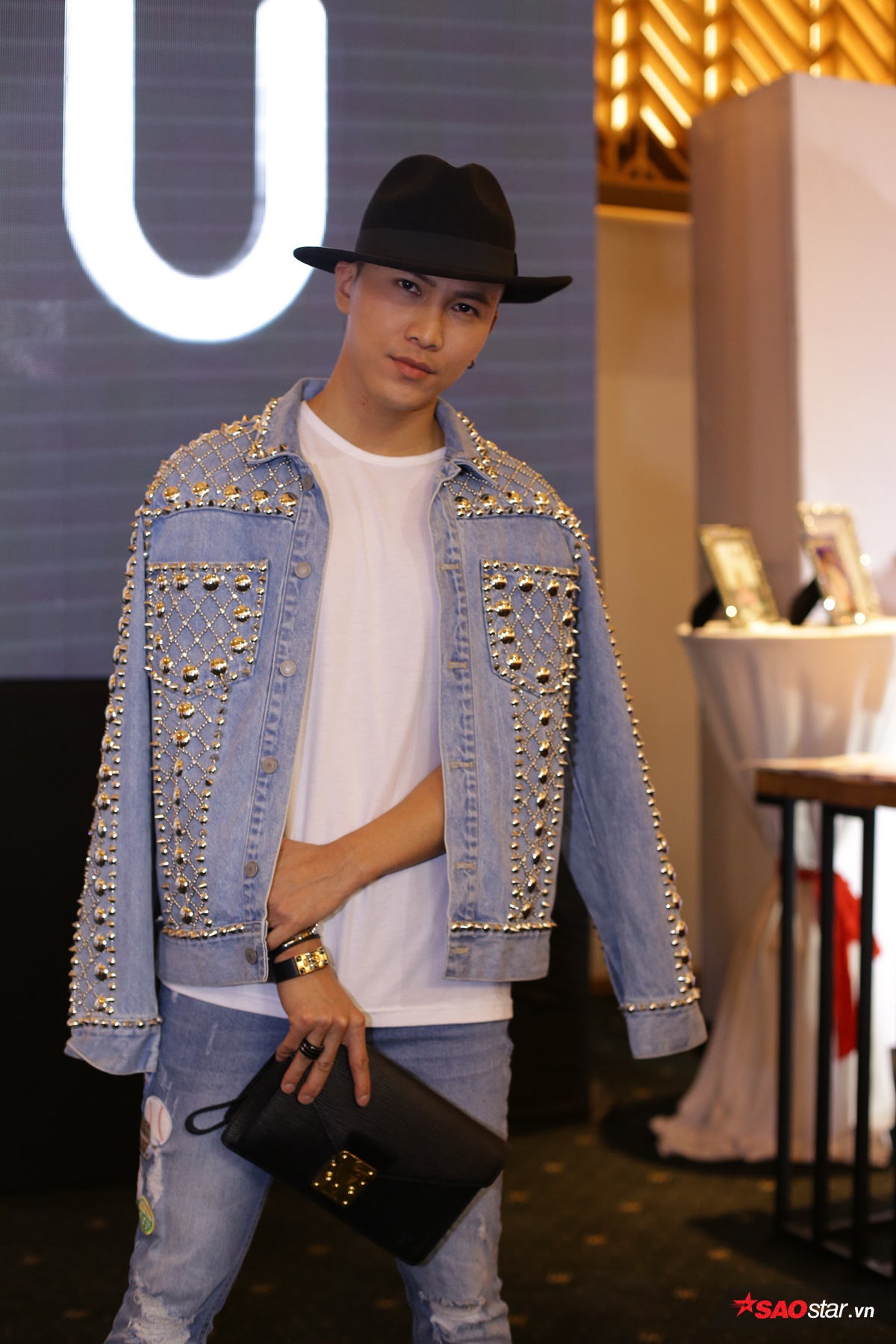 Ca sĩ Mai Tiến Dũng cá tính với set đồ jeans đinh tán khác xa với hình ảnh bình thường mà anh đang xây dựng. Ngoài set đồ của Chung Thanh Phong thì anh chọn loạt phụ kiện với giày CL, clutch LV, vòng tay Hermes.