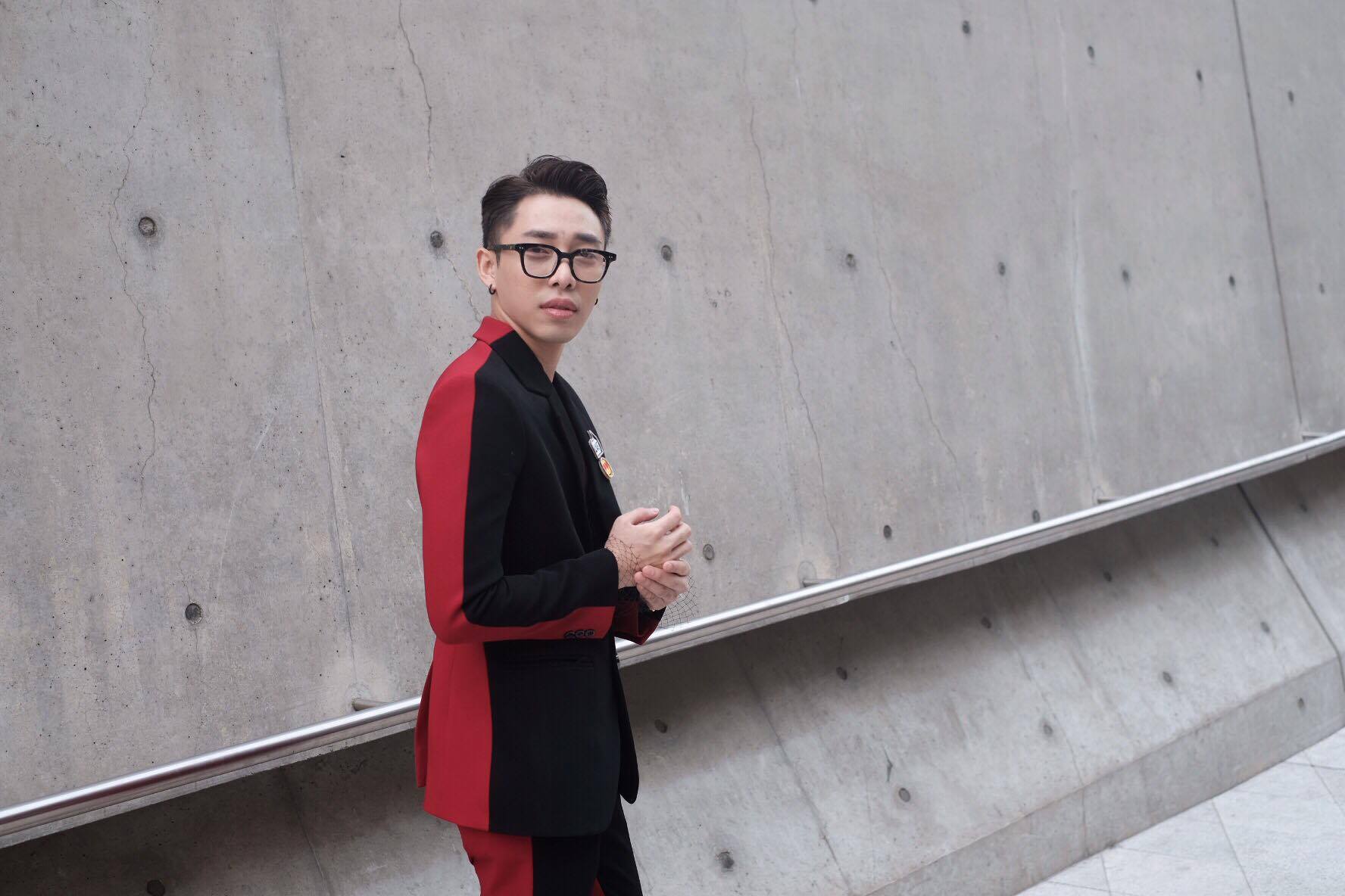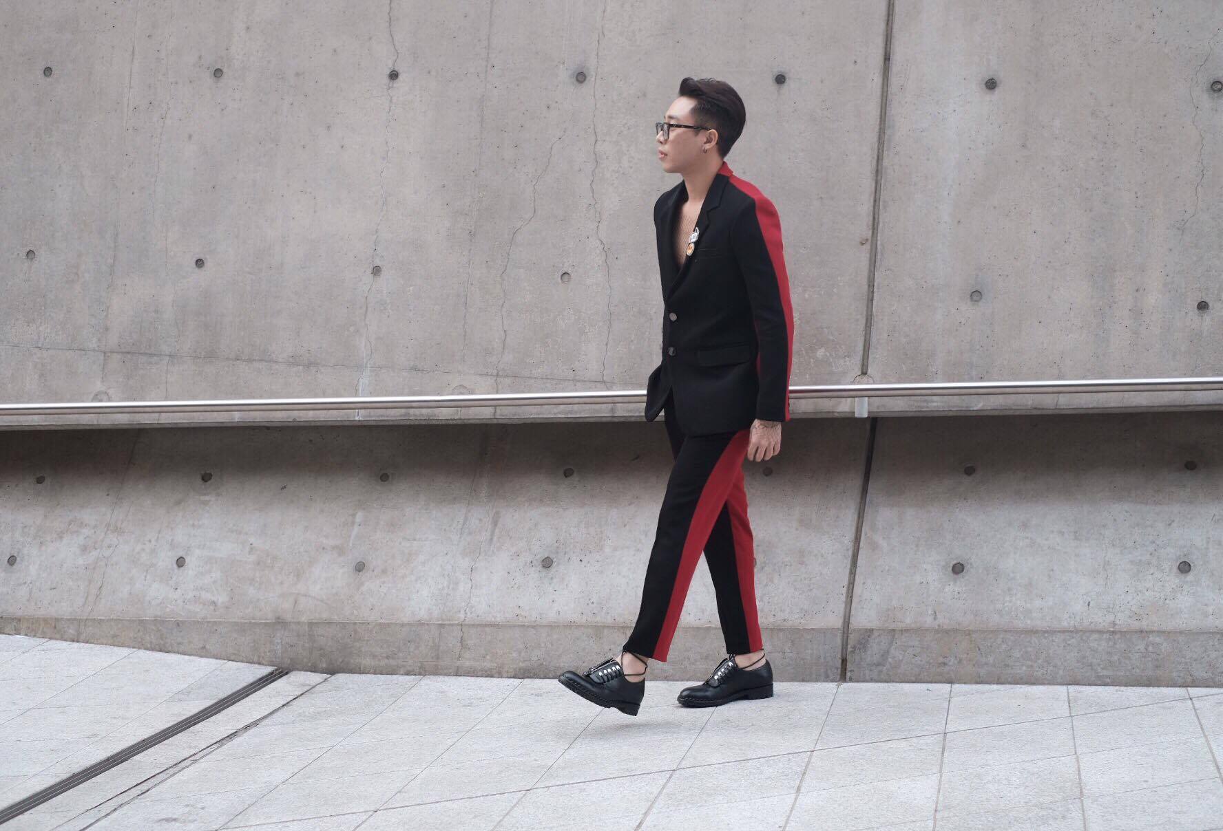 Hoàng Ku có niềm đam mê mãnh liệt với suit, tham dự Seoul Fashion Week 2017 cũng không ngoại lệ, anh tiếp tục chọn suit đồng hành cùng mình. Lần này, anh diện thiết kế suit với tông màu bất đối xứng khá mới lạ của NTK Trần Ngọc Chiến, mix layer cùng áo lưới mắt cá màu đen vô cùng cuốn hút. Để tăng thêm phần bảnh bao, Hoàng Ku chọn giày tây từ thương hiệu Balenciaga.