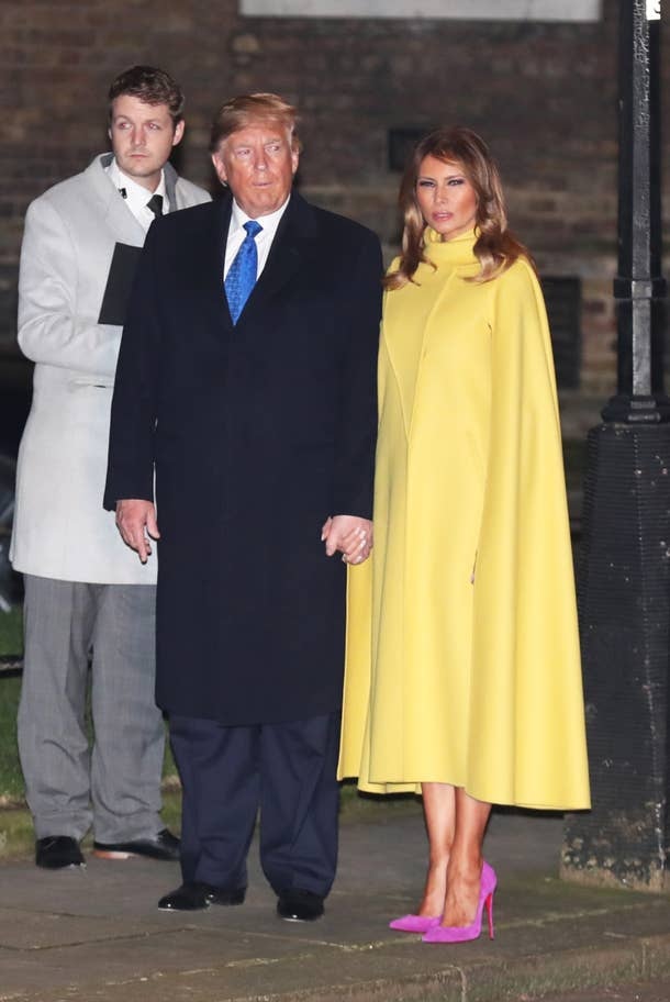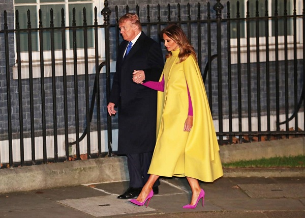 Đệ nhất phu nhân Melania Trump tỏa sáng bên cạnh Tổng thống Donald Trump khi xuất hiện ở Điện Buckingham.Đầm Cape màu vàng được bà mix nền nã cùng kiểu váy tím mặc bên trong “xuyệt tôn” cùng đôi cao gót bít mũi