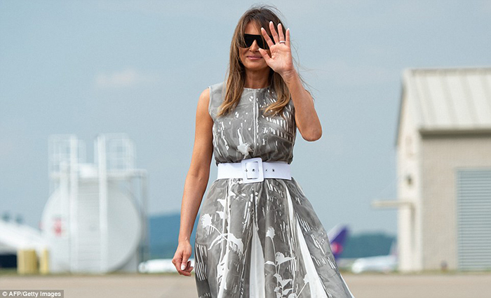 Trên đường băng lên máy bay, đệ nhất phu nhân vui vẻ vẫy tay chào báo chí và mọi người. Bà luôn nở nụ cười thân thiện với đội cảnh vệ. Tuy nhiên, khi bước lên chiếc máy bay quân sự tại sân bay Joint Base Andrew, bang Maryland, bà gặp sự cố với trang phục.