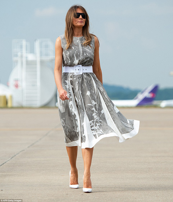 Đệ nhất phu nhân Mỹ xuất hiện ở sân bay với một chiếc váy midi sát nách họa tiết màu xám - trắng với thắt lưng to bản. Qúy bà 48 tuổi sành điệu nhất chính trường thế giới rất quyến rũ và nổi bật vì chiều cao ấn tượng và thân hình săn chắc thon thả. Bà đeo thắt lưng trắng tiệp màu với giày cao gót hàng hiệu rất sành điệu.