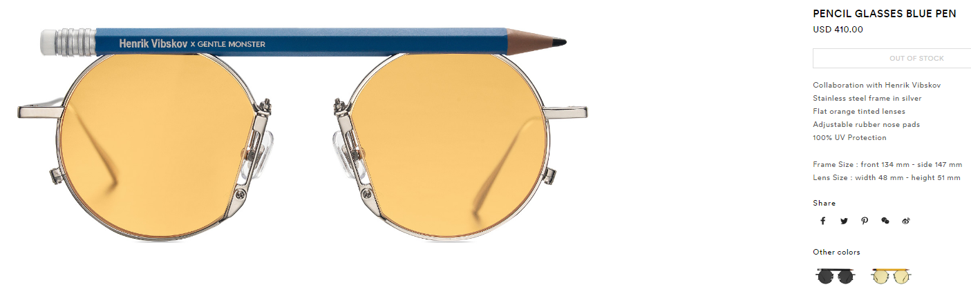410 USD tương đương với khoảng gần 9 triệu 500 ngàn đồng cho chiếc mắt kính bút chì. Gentle Monster chưa khi nào “thất thủ” trước những thương hiệu cạnh tranh khác vì bất kỳ mẫu kính mới nào ra mắt cũng nhanh chóng trở thành item hot trend, được các tín đồ thời trang “check in” rần rần khắp mọi nơi.