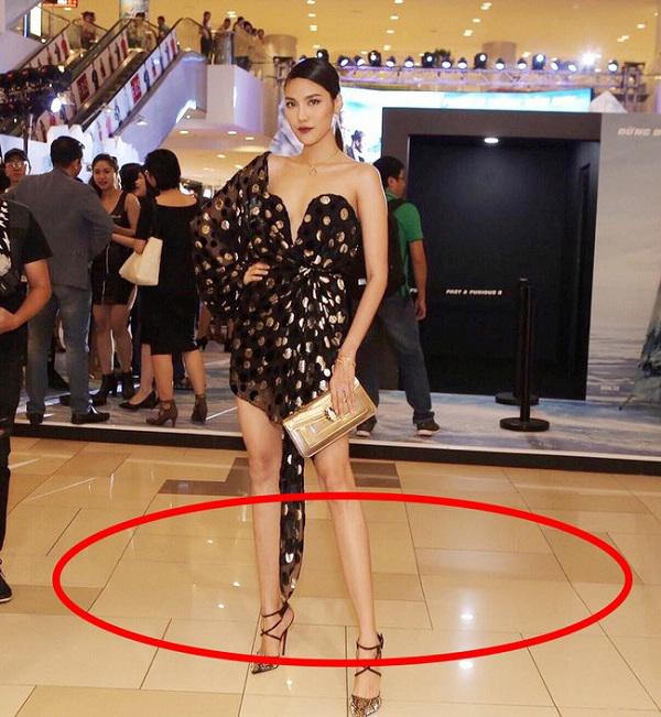 Dễ dàng nhận ra phần nền gạch dưới chân cô cũng bị lệch lạc, méo mó như một phần hậu quả của việc chỉnh phần chân quá đà của Lan Khuê.