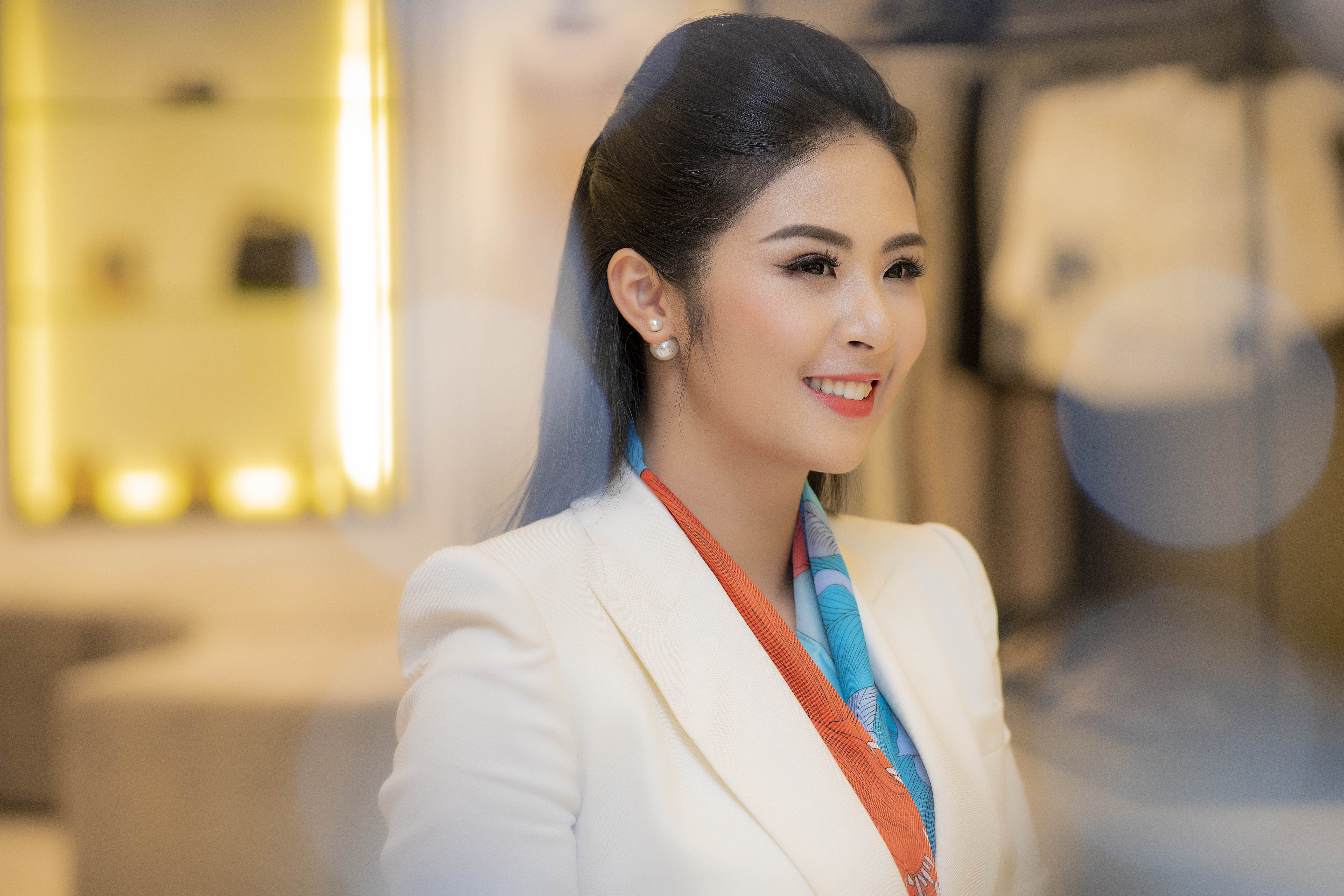 Cô đến khá muộn vì lịch trình dày đặc, được biết, chỉ còn vài ngày nữa, cô sẽ chấm dứt nhiệm kỳ Hoa hậu Việt Nam và trao lại vương miện cho một người đẹp khác.