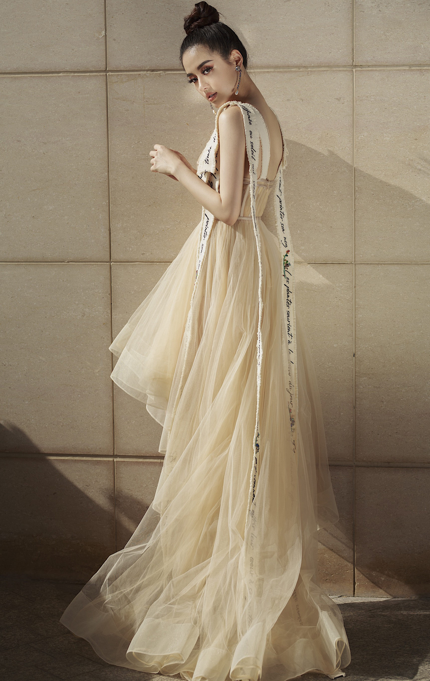Người đẹp phối cùng một chiếc nơ thêu nhẹ nhàng, nhằm tạo điểm nhấn cho tổng thể.