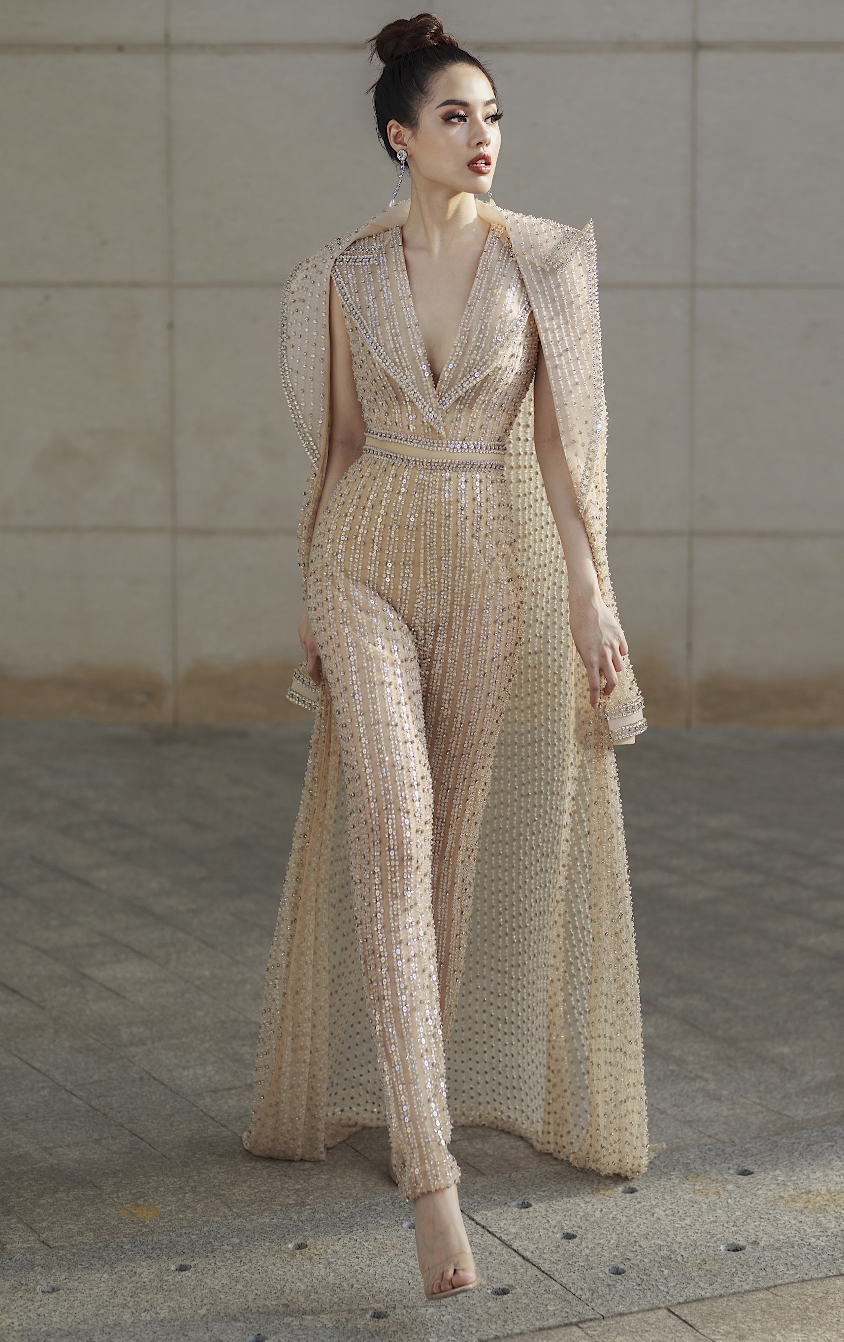 Ngoài ra, trong bộ ảnh, người đẹp team Minh Tú còn lựa chọn một bộ jumpsuit màu nude. được đính kết tỷ mỷ, phối cùng áo khoác dáng dài.