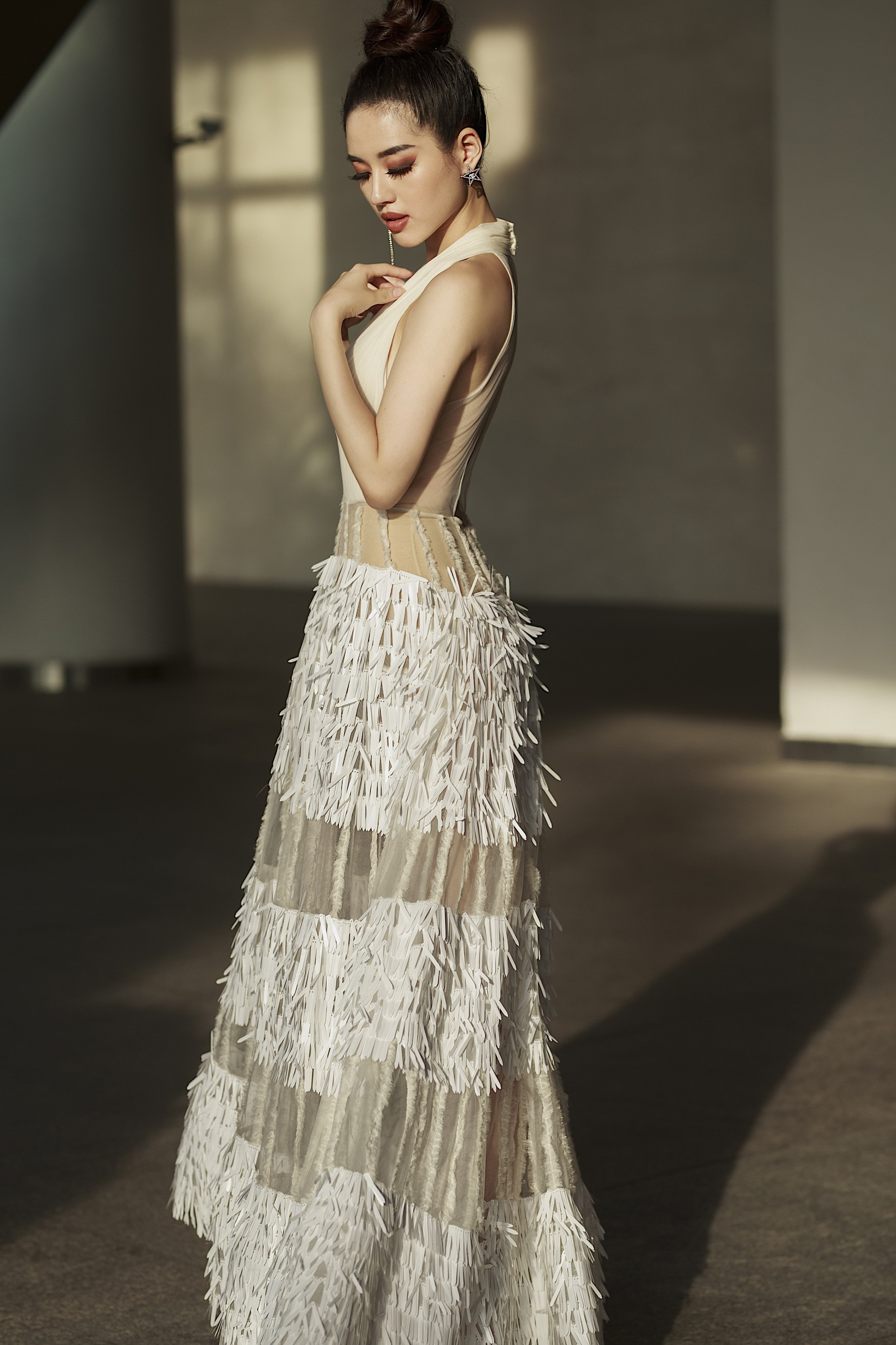 Người đẹp sinh năm 1995 khéo léo kết hợp trang phục cùng hoa tai dáng dài và kiểu tóc bới cao, tôn lên làn da trắng sứ cùng đôi mắt to, trong sáng.