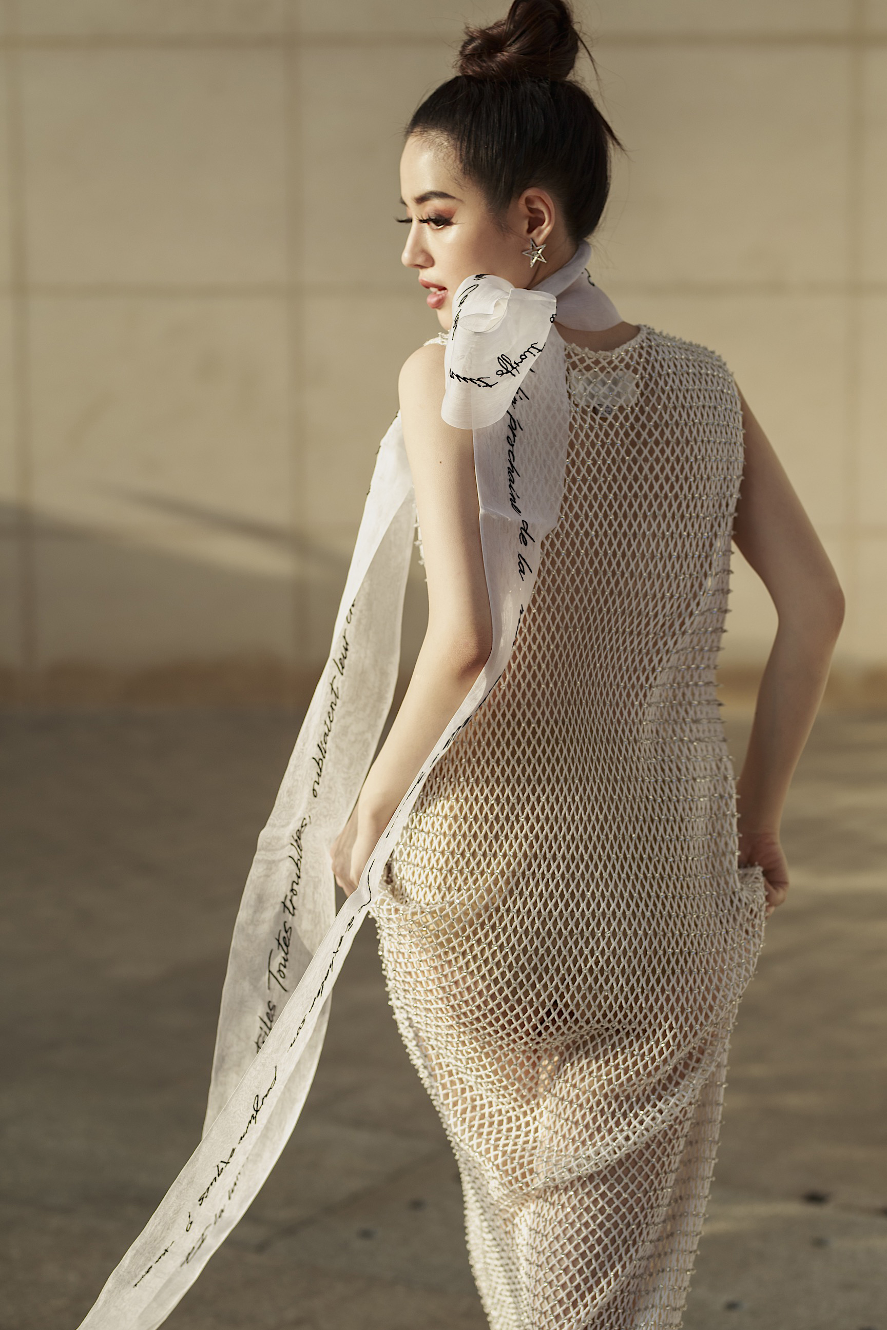 Thiết kế cuối cùng là một chiếc váy dài xẻ ngực, chất liệu lưới đan vô cùng sexy nhưng chẳng hề lộ liễu, hở bạo.