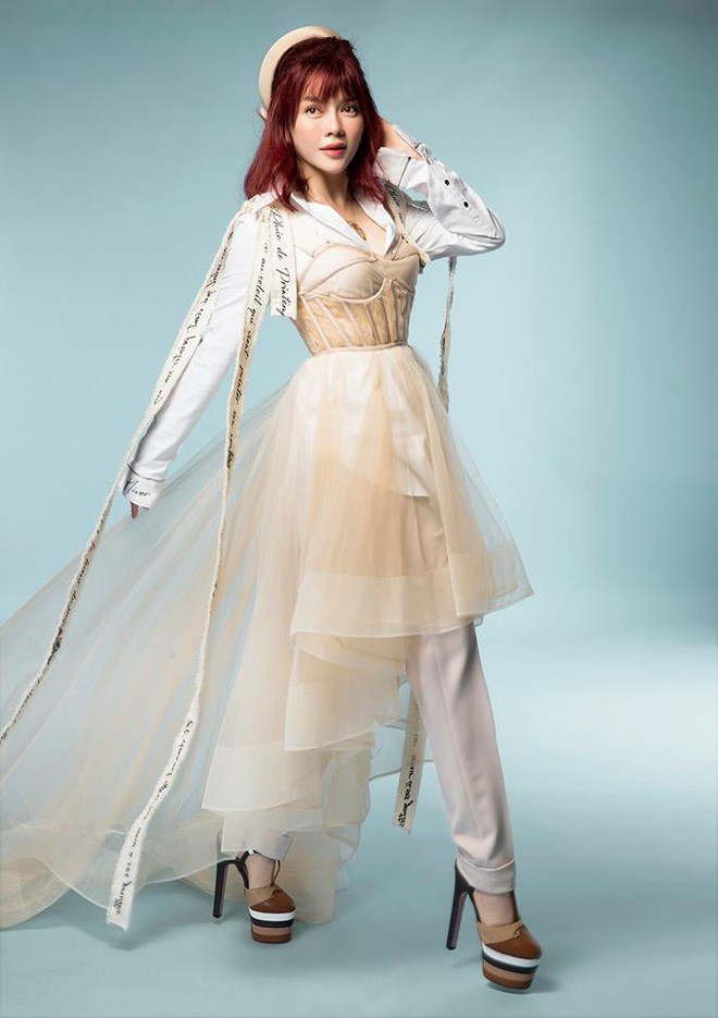 Kỳ Duyên cũng từng mặc qua chiếc đầm này khi chụp bộ ảnh mừng sinh nhật. Người đẹp cũng mix chiếc váy với áo sơ mi giống Lý Nhã Kỳ. Được biết, đây là cách phối nguyên set trang phục của NTK Công Trí, từng được trình diễn tại VIFW Thu, Đông 2017.