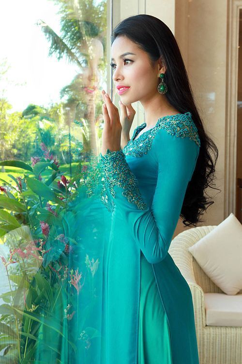 - Các cô nàng muốn tạo sự ấn tượng như Phạm Hương cùng trang phục áo dài thì hãy chọn những chiếc mấn độc đáo, hoa tai hay các chi tiết thêu nổi bật trên trang phục. Tông màu vàng đồng, đỏ tươi hay xanh cổ vịt cũng phù hợp với các nàng yêu thích nét chấm phá trên trang phục.