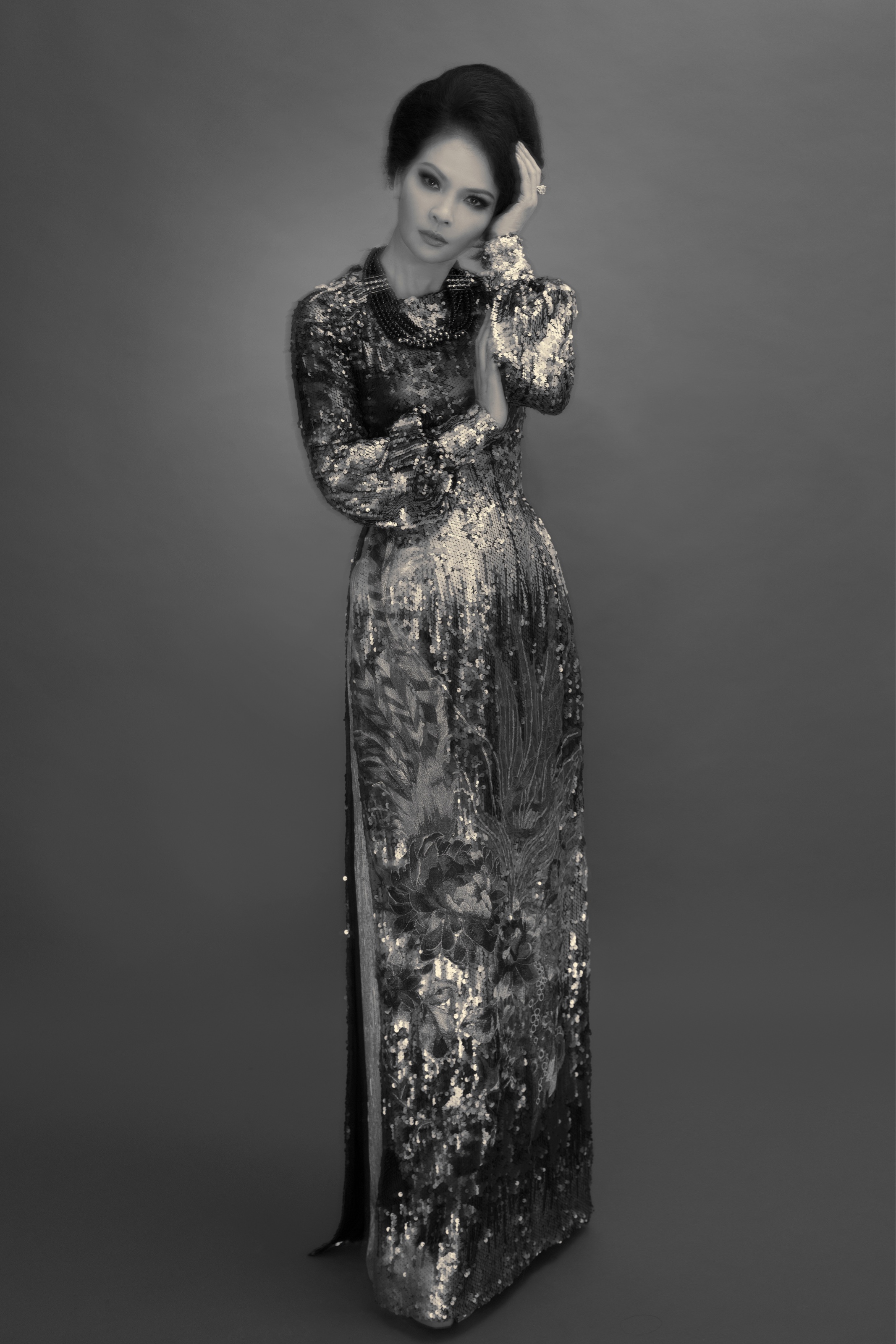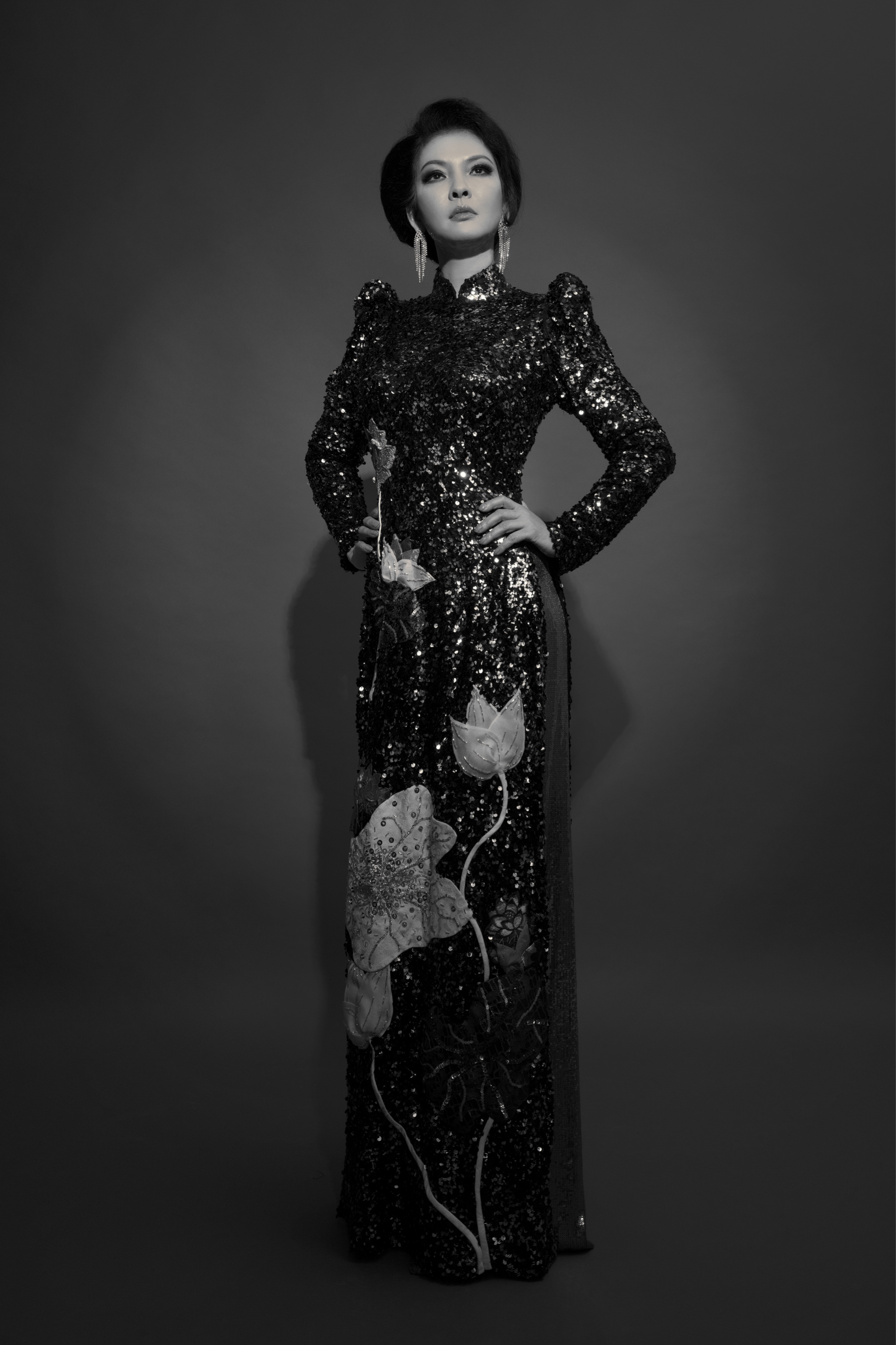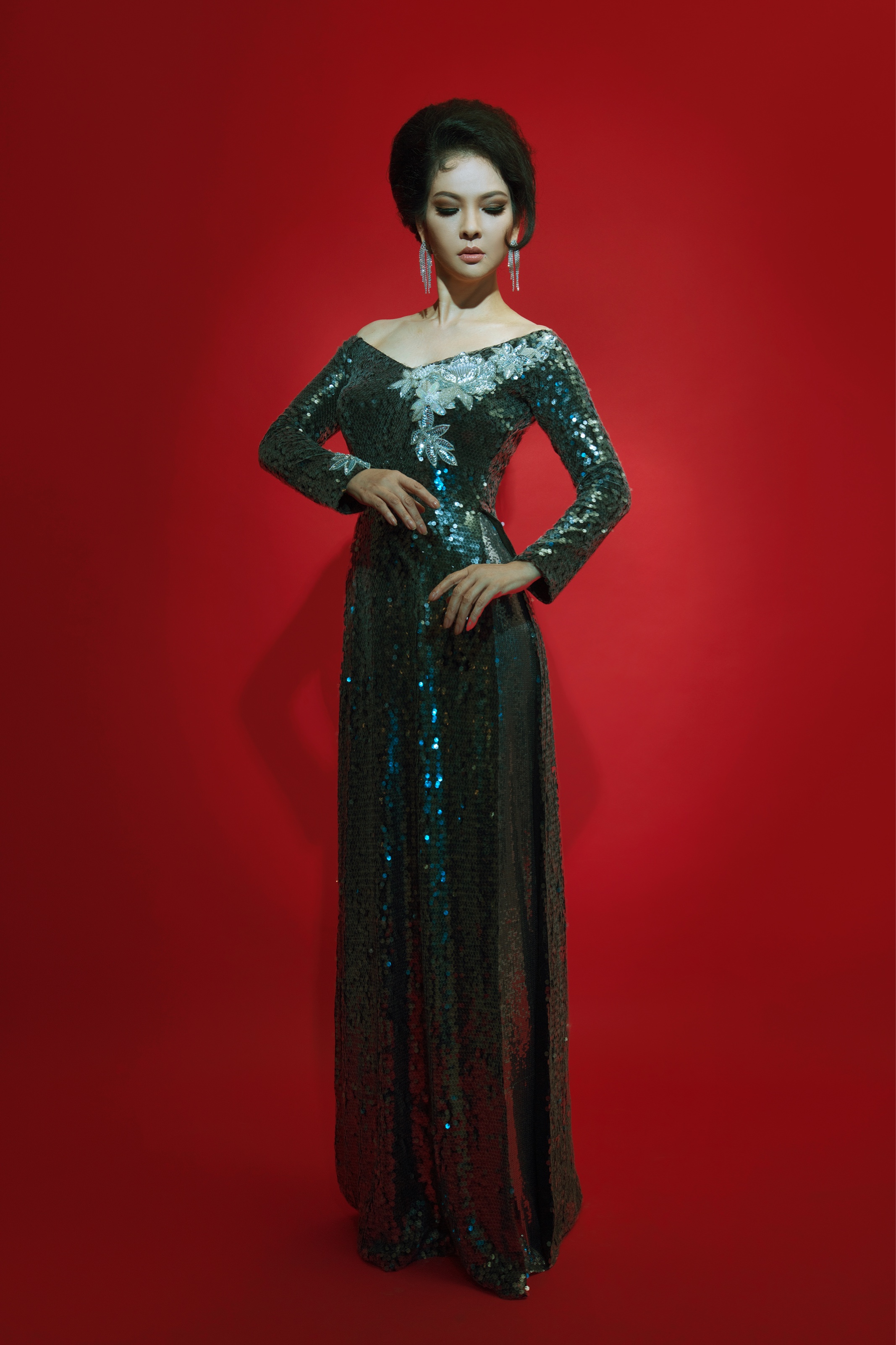 Diện áo dài sequin trễ vai, người đẹp khoe bờ vai cùng làn da trắng sứ mà không hề phô phang.