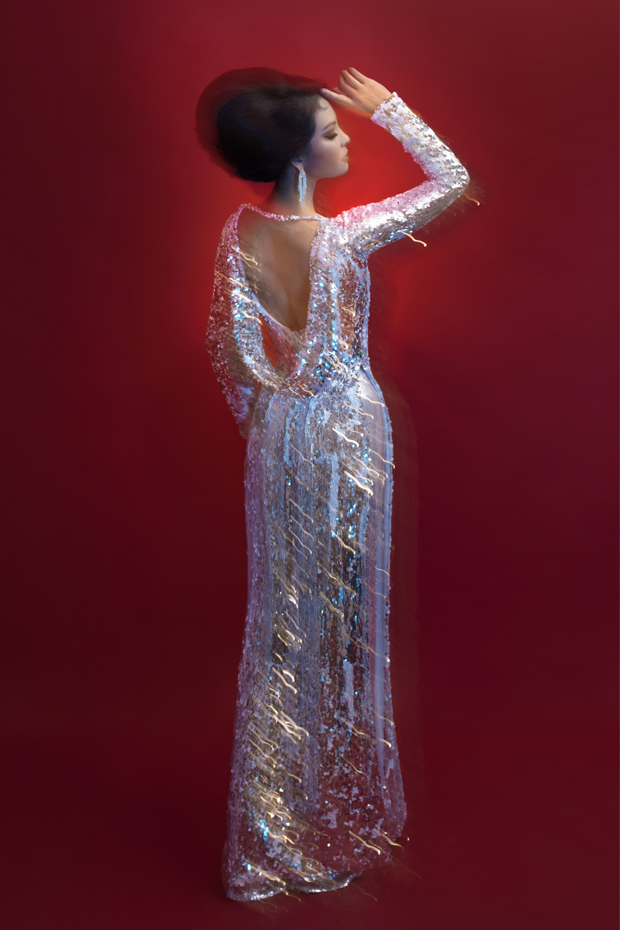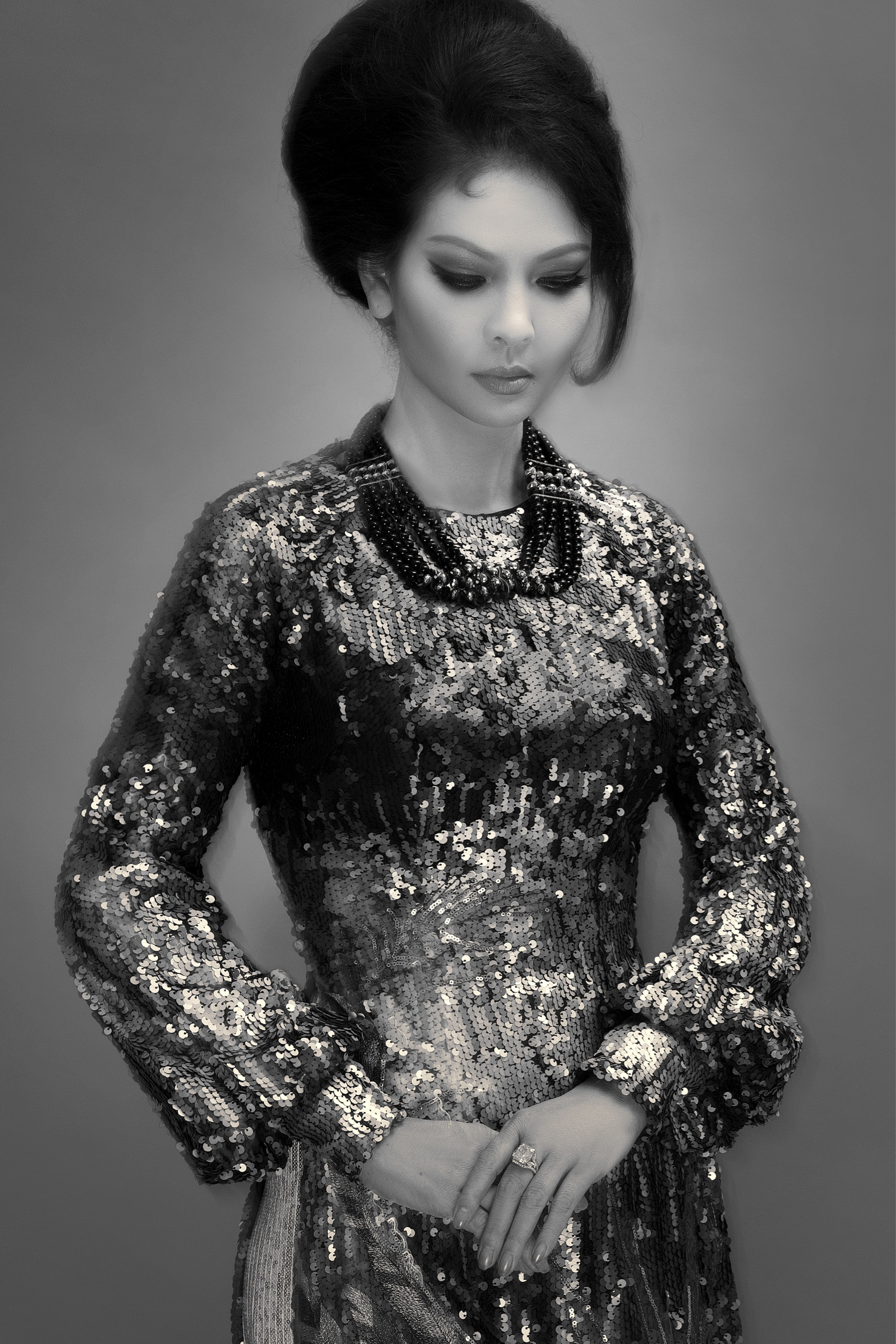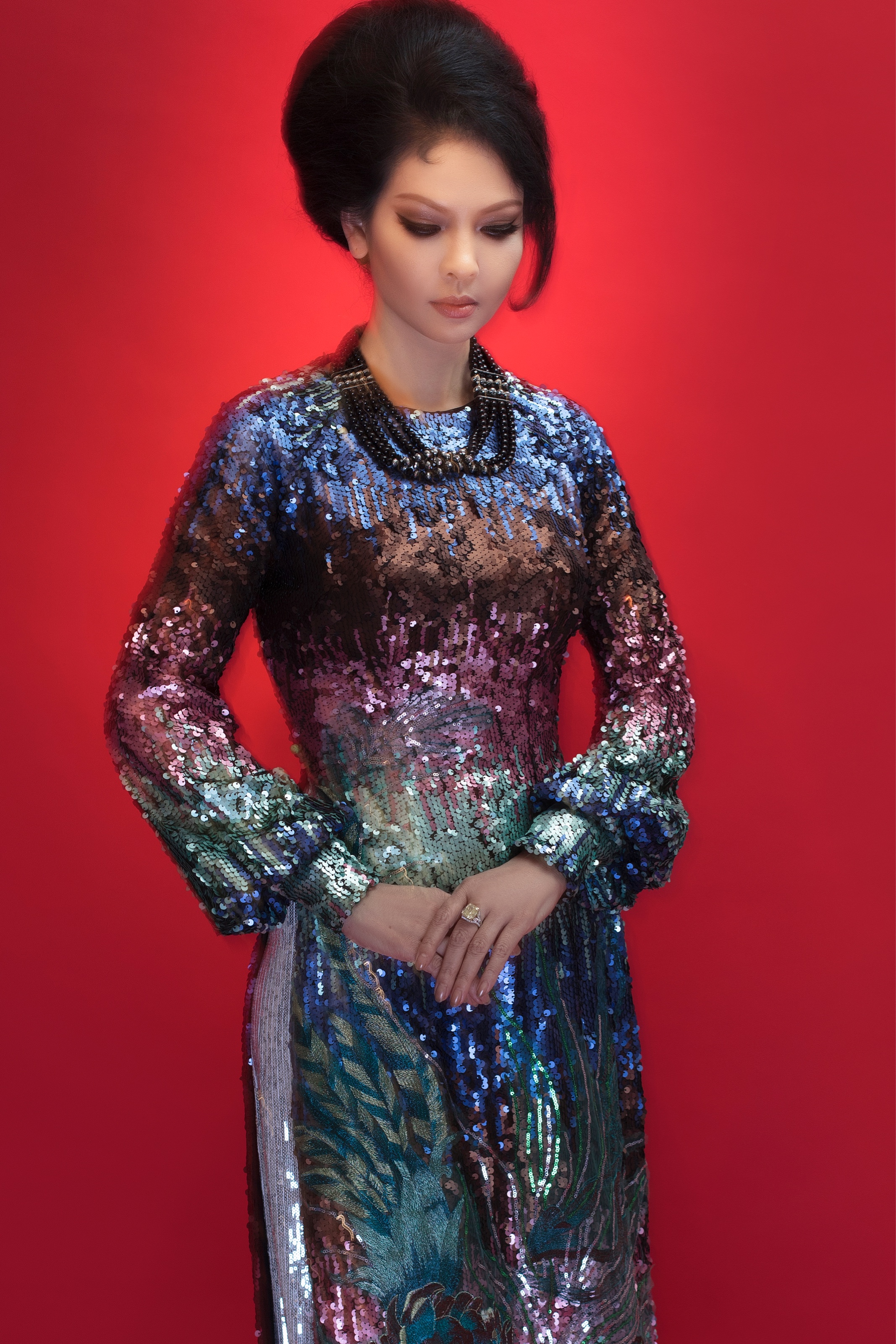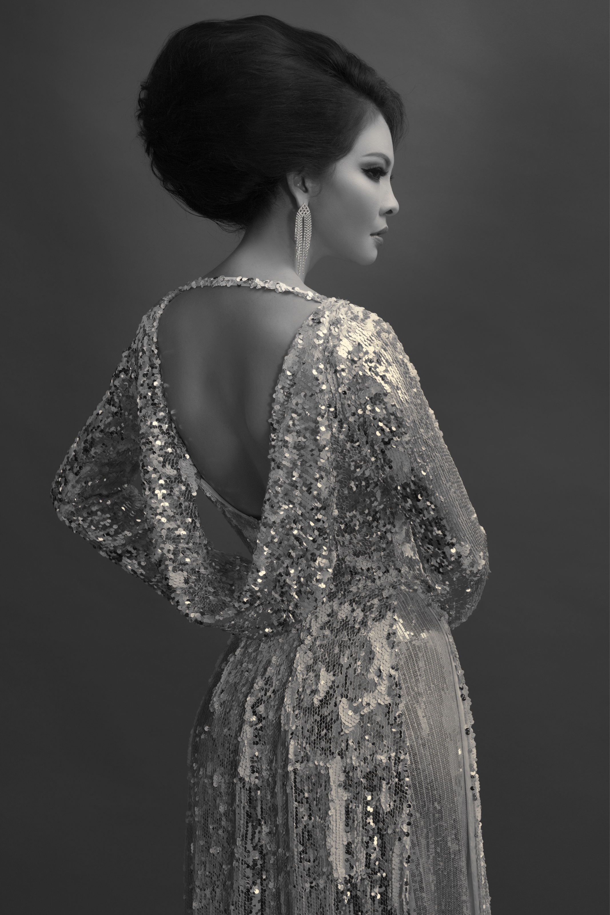Diện áo dài sequin trễ vai, người đẹp khoe bờ vai cùng làn da trắng sứ mà không hề phô phang.