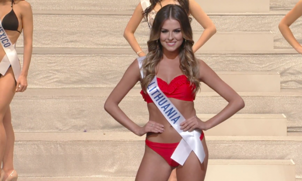 Với bikini màu cam đỏ nổi bật, phần trình diễn của hoa hậu Lithuania nhận được rất nhiều tiếng vỗ tay ửng hộ của khán giả.