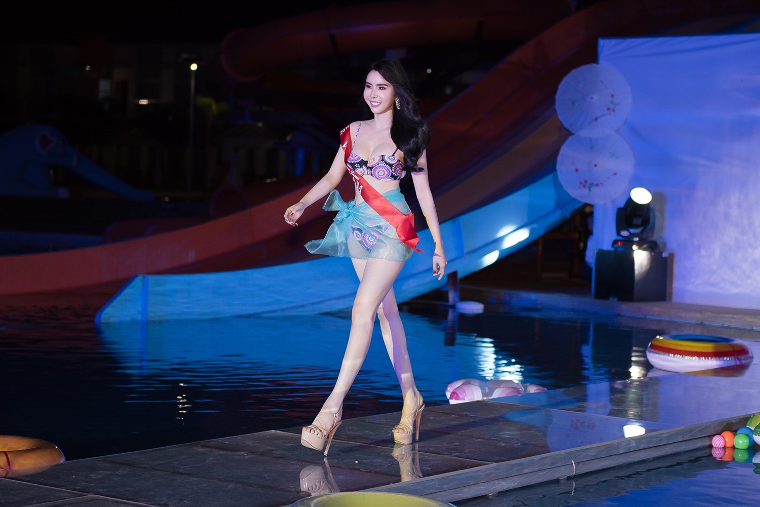 Là phần thi phụ đầu tiên, đại diện Việt Nam đã có phần thể hiện quyết tâm và xuất sắc khi có những sải bước đầy tự tin trong bộ trang phục áo tắm nóng bỏng.