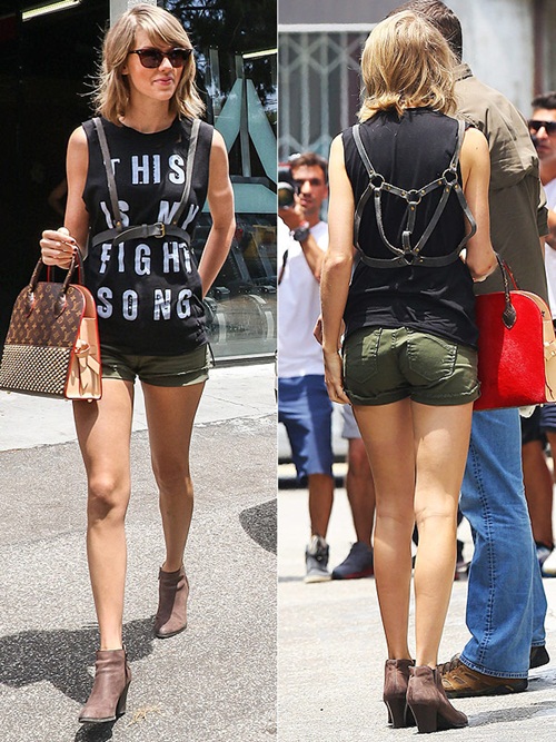 Taylor sử dụng dây harness như một điểm nhấn cho street style với những item đơn giản của cô khi xuống phố, khá lạ mắt.