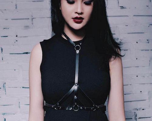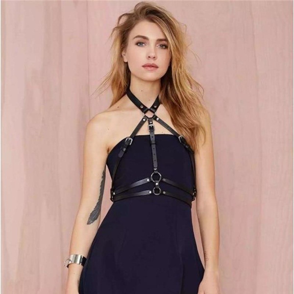 Đôi khi sexy khi dây da ôm trọn phần thân trên của người phụ nữ cùng những khuyên tròn đính kết các sợi dây da.