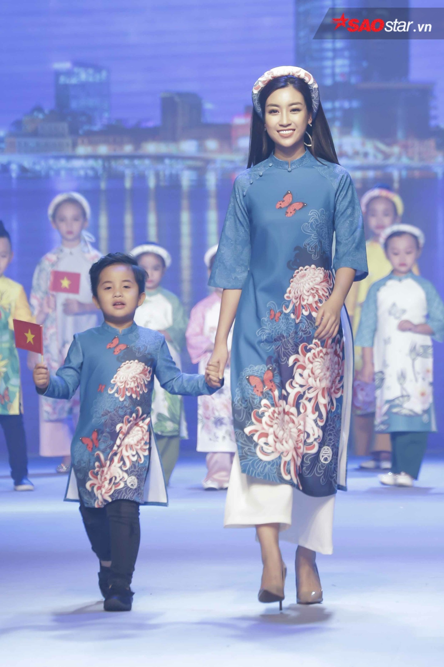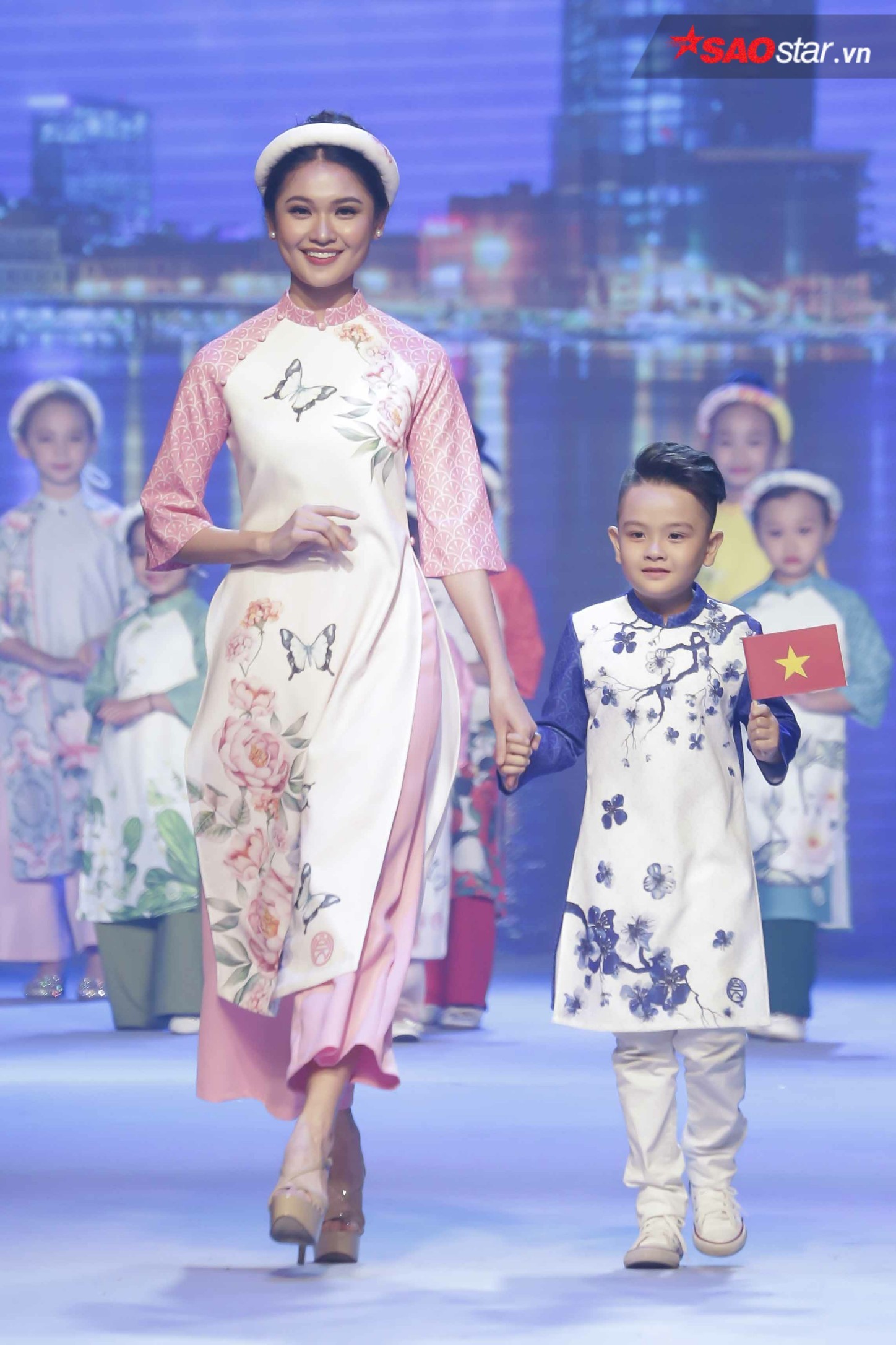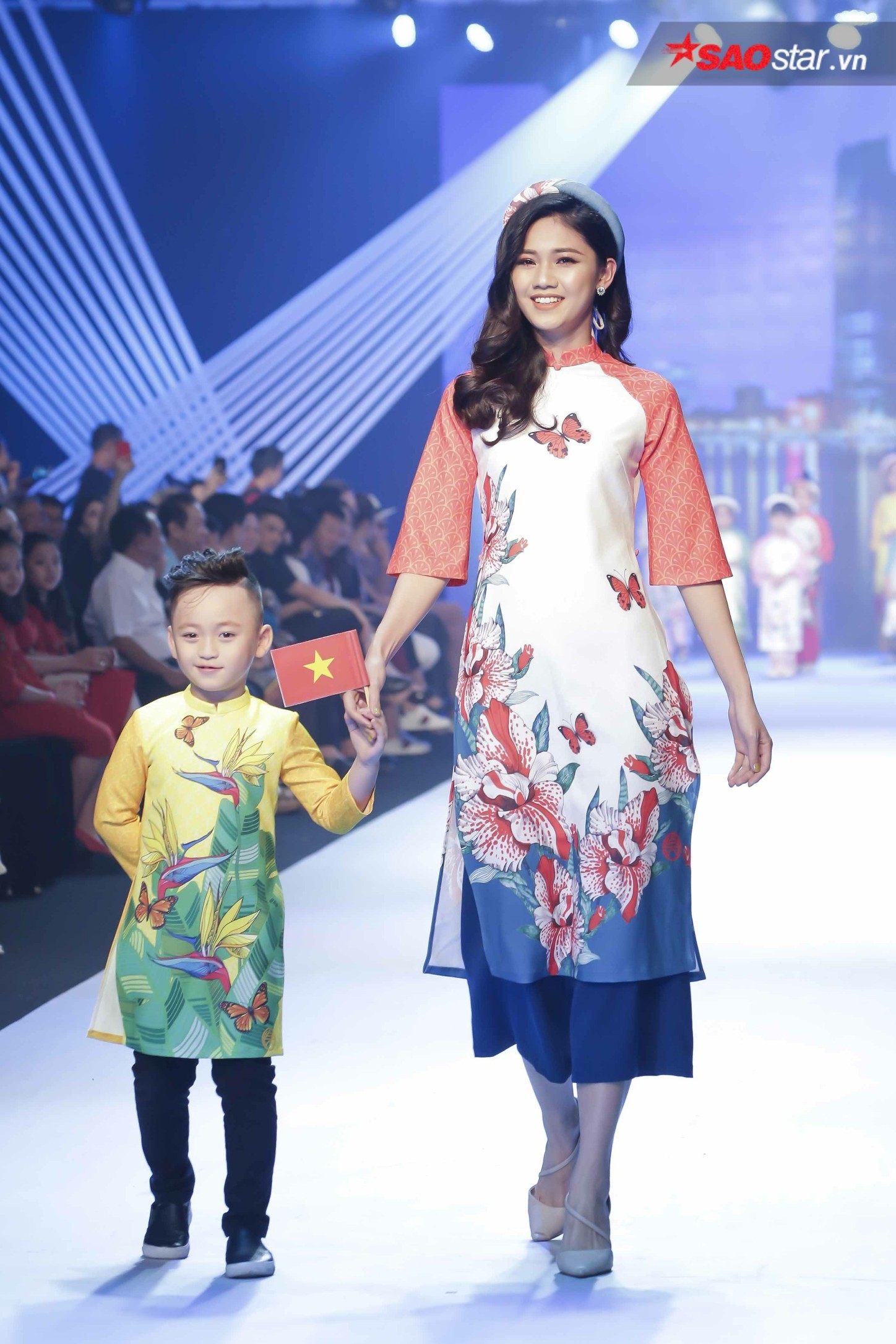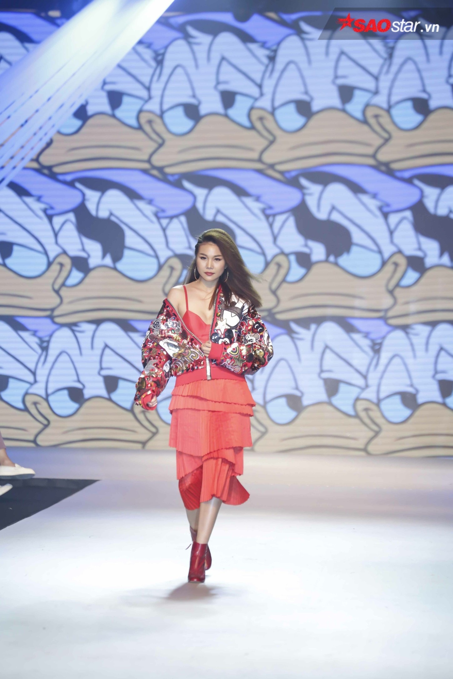 Á hậu Tú Anh cũng nhận lời trình diễn trong BST của đàn chị, người đẹp chưng diện tà áo tay lỡ, in họa tiết hoa bướm bắt mắt.