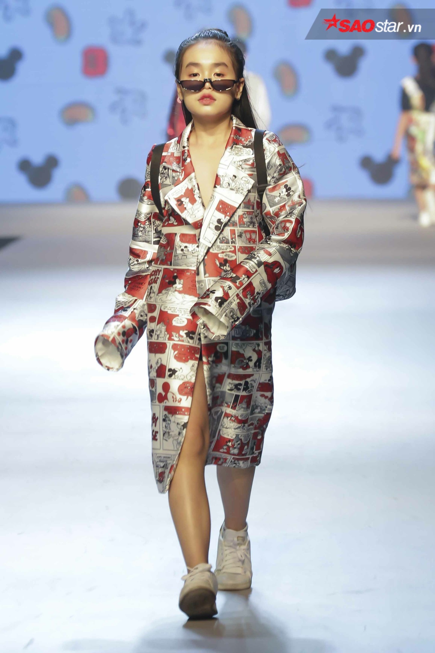 Trong sự kiện lần này, Hà Nhật Tiến đem đến những thiết kế với phom dáng oversize quen thuộc. Chi tiết những bản in hoạt hình được NTK sử dụng lặp lại xuyên suốt 25 mẫu thiết kế.