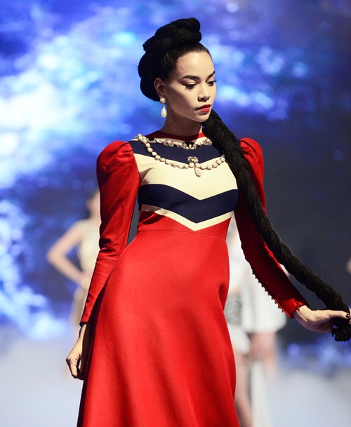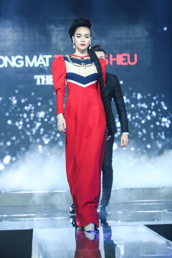 Có thể thấy, với chiếc đầm đỏ rực đắt đỏ, Hà Hồ lấn át hoàn toàn vị huấn luyện viên Phạm Hương, Lan Khuê khi cùng đọ sắc trên thảm đỏ.