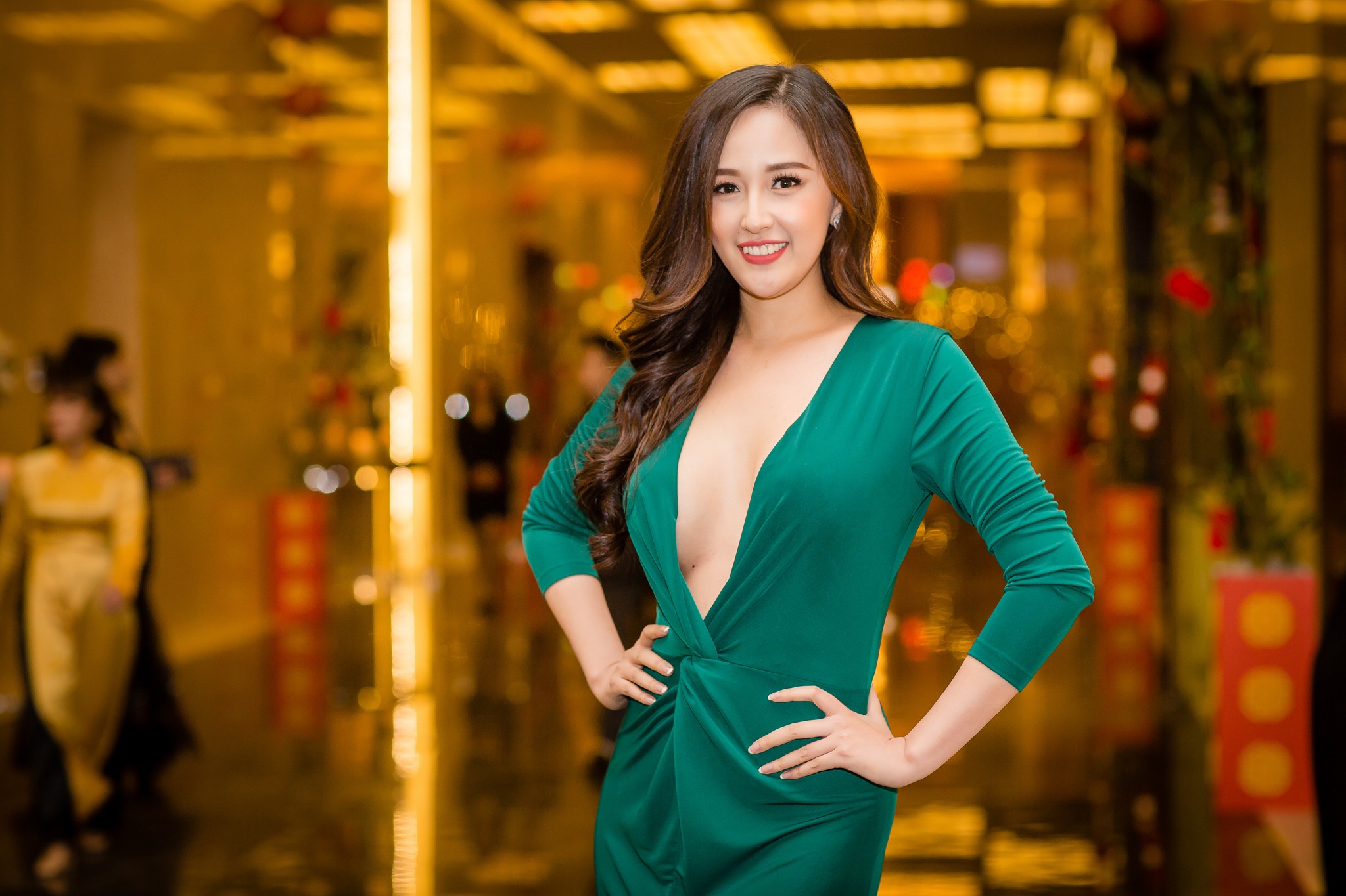 Đường xẻ tà ở chân váy và phần cổ khoét sâu giúp mỹ nhân khéo khoe đôi chân dài miên man và vòng một đầy đặn. Vì muốn thay đổi so với những lần xuất hiện trước, Mai Phương Thúy thử nghiệm với phong cách trang điểm khác từ xưa đến giờ.