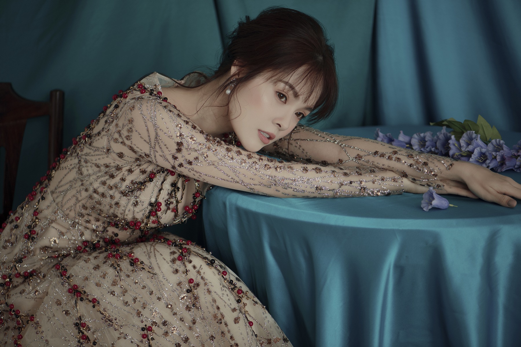Với bộ váy dạ hội đính kết hạt trang trí màu đỏ này, Dương Cẩm Lynh lựa chọn phối với phụ kiện hoa tai ngọc trai.