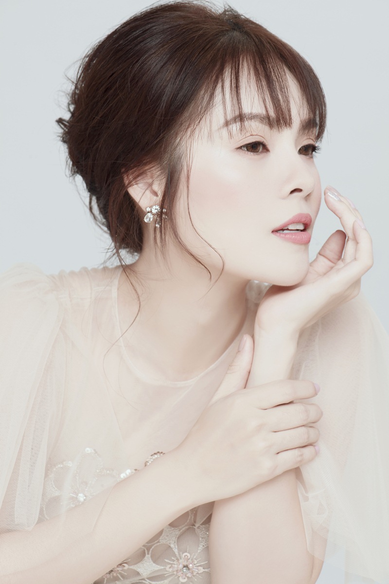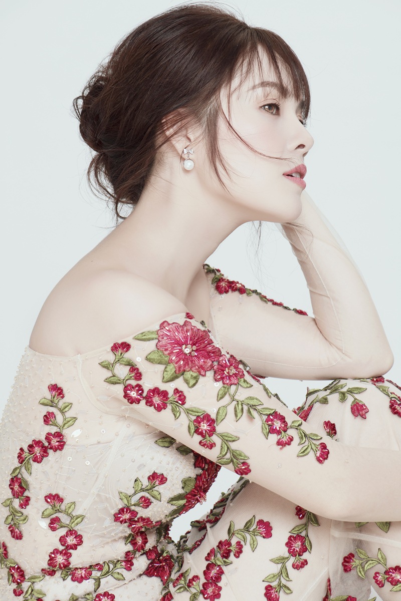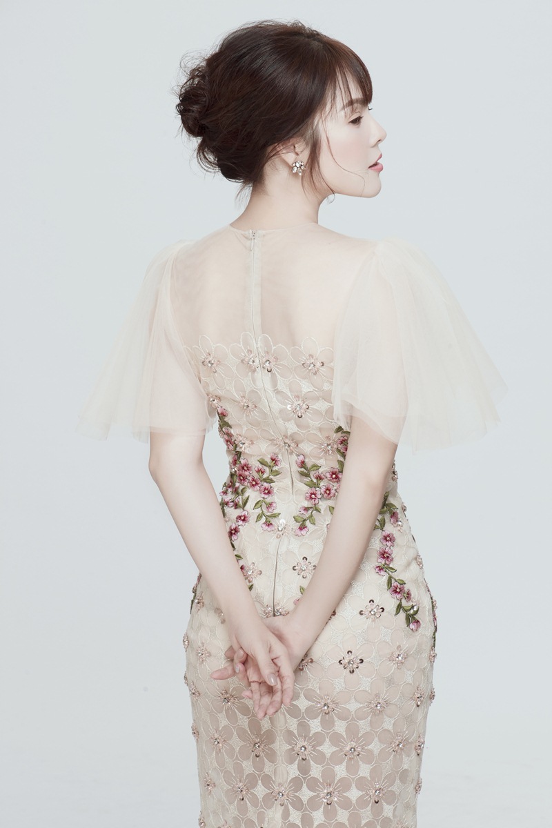 Gương mặt được trang điểm điểm nhẹ nhàng, trong veo kết hợp cùng kiểu tóc búi thấp trễ nãi tạo nên tổng thể thanh tao, phù hợp với trang phục người đẹp đang diện.