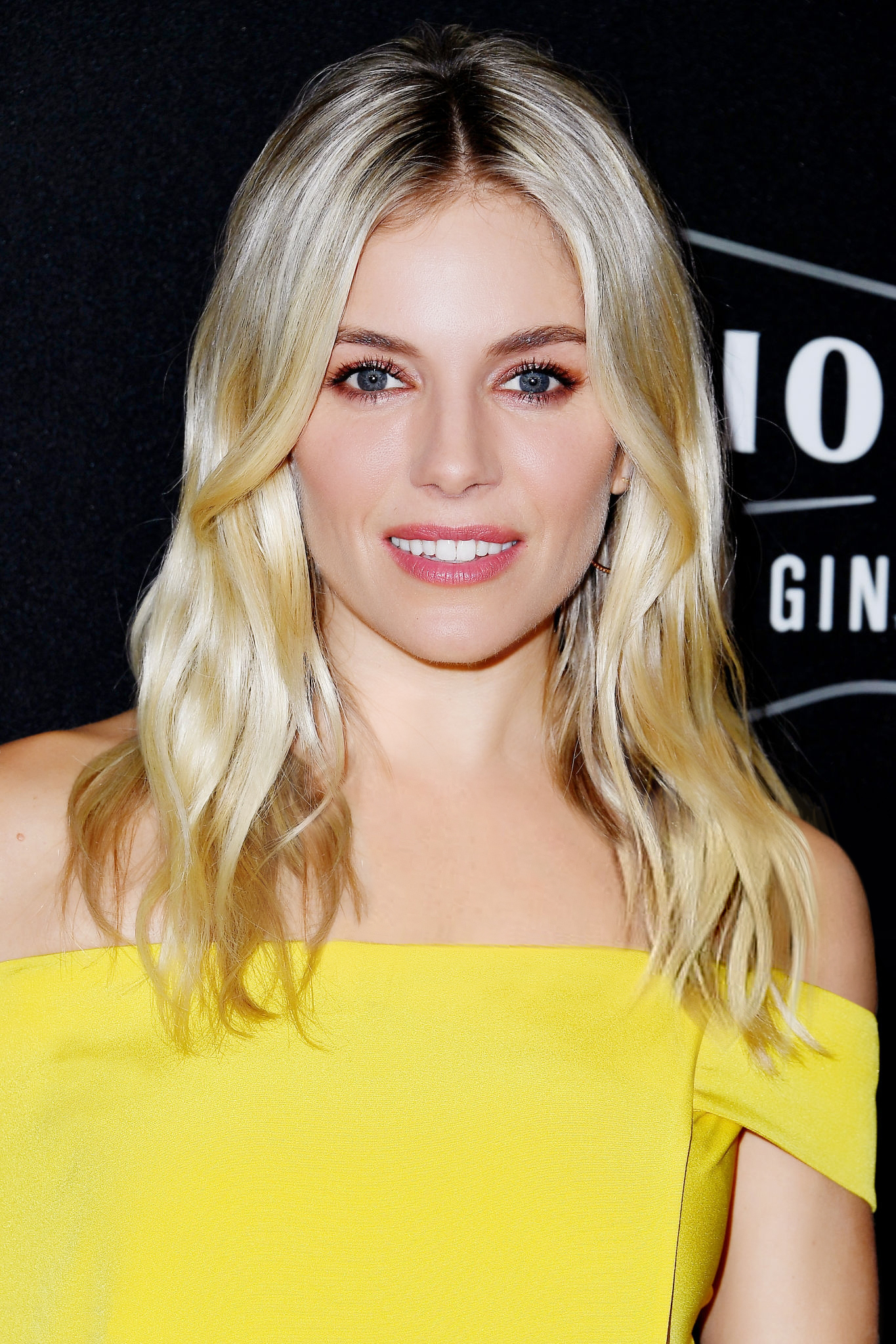 Sienna Miller khoe khéo đôi vai trần gợi cảm bằng một mẫu đầm suông xẻ tà màu vàng tươi, gợi liên tưởng đến sự rực rỡ của một ngày đầu mùa hạ.