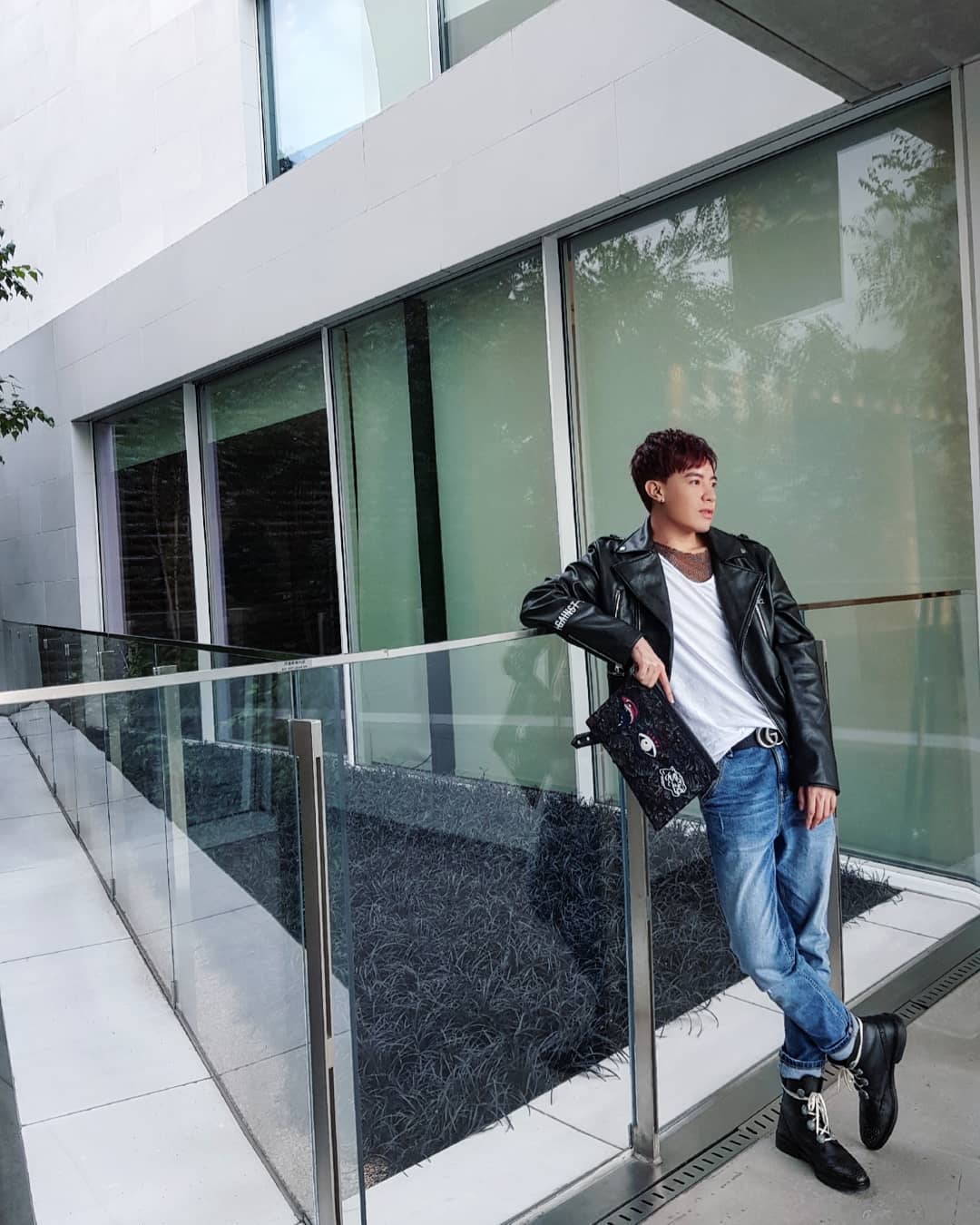 Stylist Mạch Huy diện street style “chất phát ngất” gồm áo khoác da và quần jeans. Tất cả những phụ kiện đi kèm đều được anh chàng kết hợp một cách hợp lí, vừa thời trang, vừa nam tính.