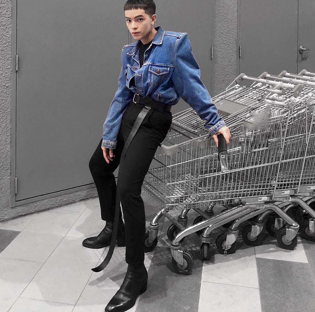 Kelbin tiếp tục khiến các tín đồ thời trang “phát cuồng” cùng combo áo khoác độn vai và quần skinny đen ôm sát, điểm nhấn là sợi dây thắt lưng dài cả mét cực lạ.