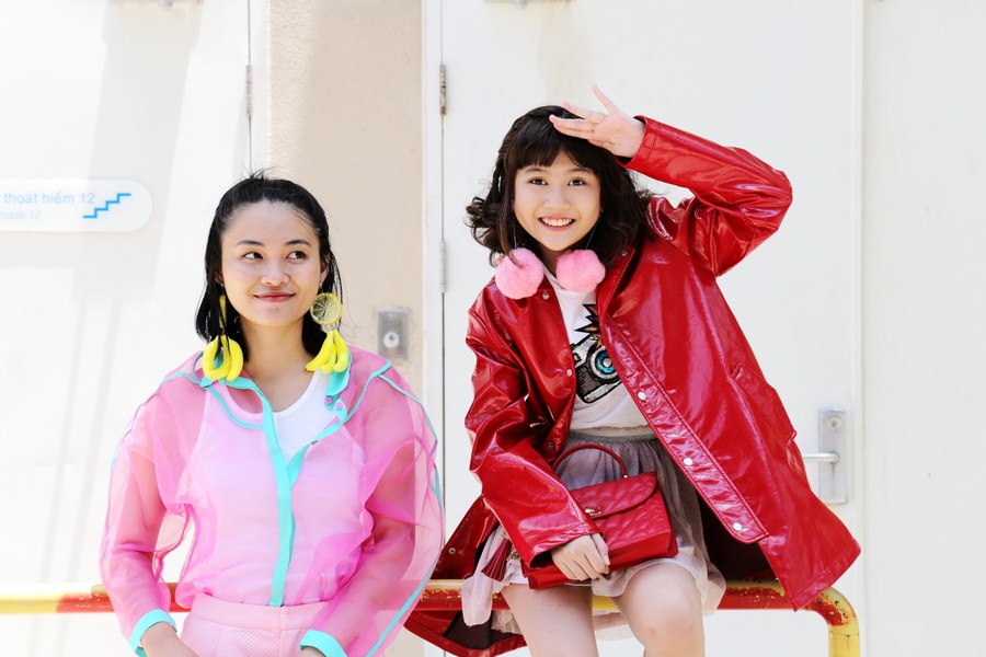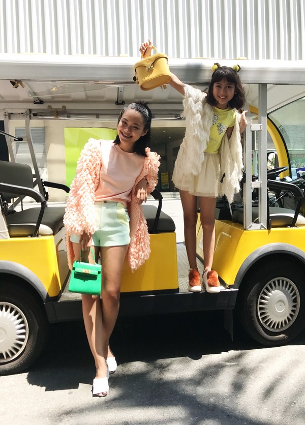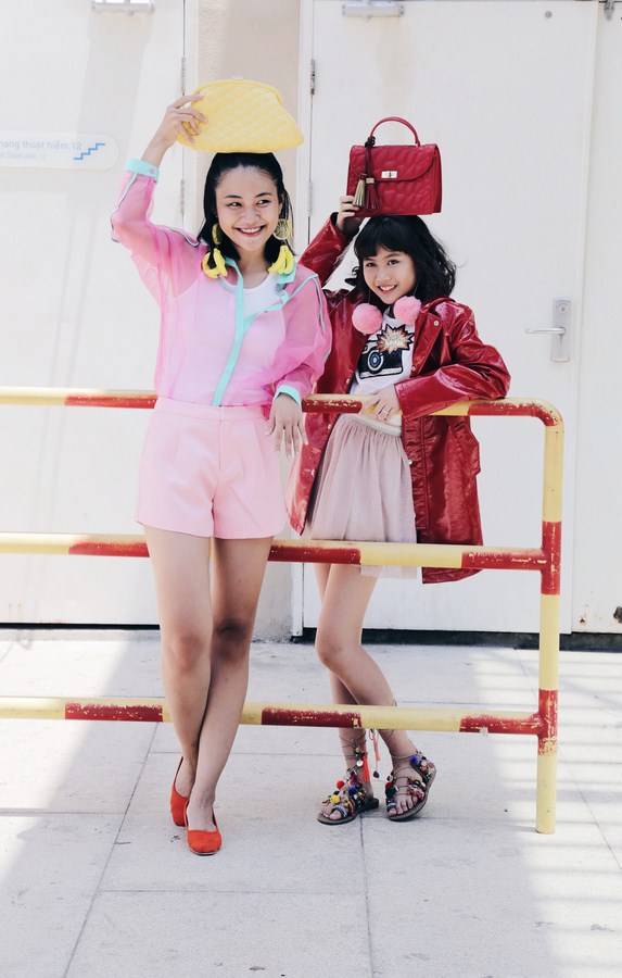 Phối các tông màu nổi như vàng - xanh lá - hồng đi cùng nhau khiến cho hai chị em đúng chuẩn rực rỡ nhưng không quá chói chang. Áo khoác sợi mảnh tạo cảm giác xa hoa như khoác lông nhưng thật ra mỏng, nhẹ, mát hơn rất nhiều.