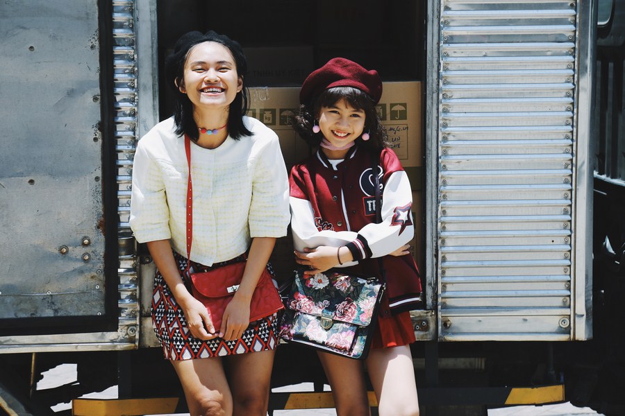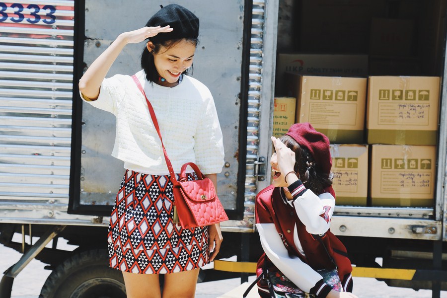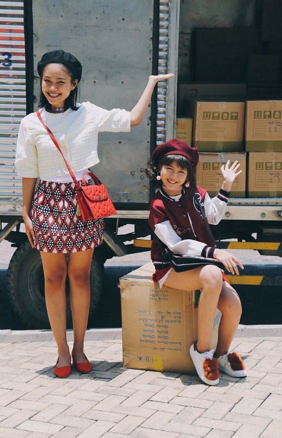 Màu đỏ rượu (burgundy) trên áo bomber của cô em cho set đồ thật sporty, màu đỏ rượu kết hợp họa tiết tribal trên váy cô chị và các trang sức bombom mang đậm cảm giác mùa hè boho.