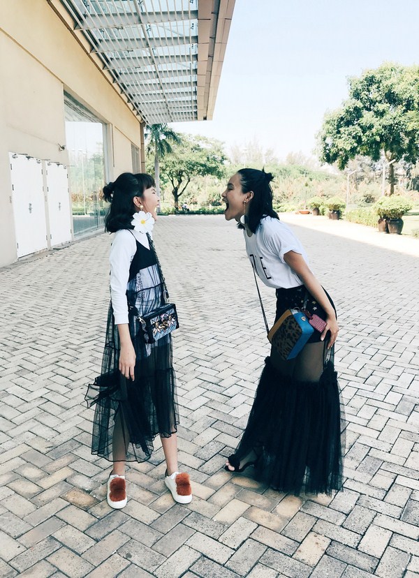 Mùa hè này, sheer power khẳng định là xu hướng mang nhiều cảm hung nhất. Bộ đôi chị em kết hợp sheer với áo phông trắng slogan mang đến vẻ hiện đại đô thị, thích hợp để du lịch hoặc thời trang sân bay.