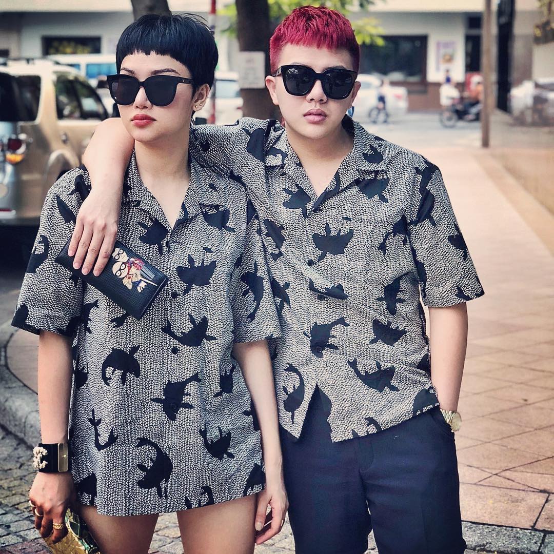 Đôi bạn thân Miu Lê, Duy Khánh Zhou Zhou lại lựa chọn mặc sơ-mi đôi khi xuống phố, cả hai cùng sử dụng kính mát Gentle Monster nhằm tăng điểm chất, ngầu.