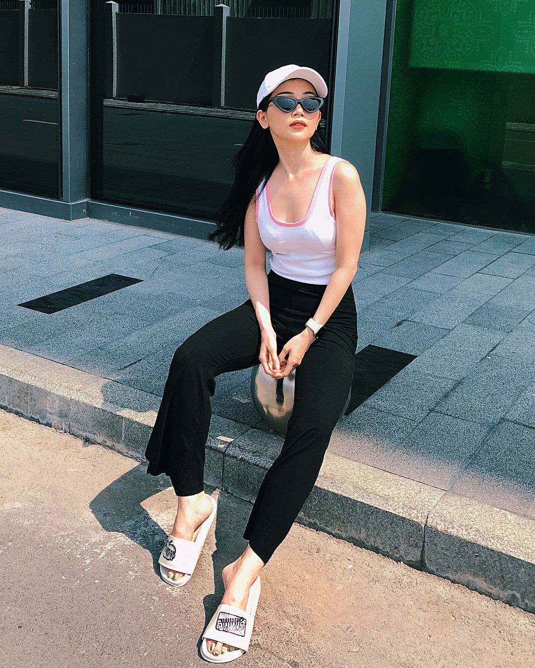 Set đồ thời thượng cùng gam màu trung tính của Sĩ Thanh càng được tăng lên khi cô nàng phối cùng kính mắt mèo đen.