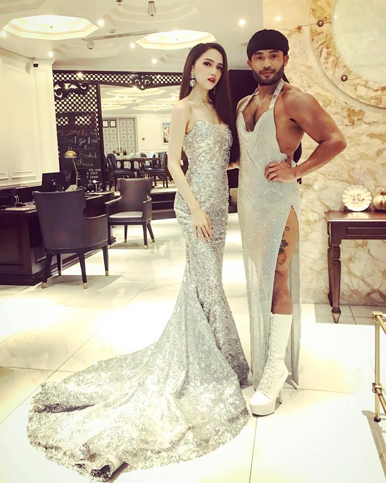 Trong một sự kiện, hoa hậu Hương Giang nổi bật với chiếc đầm đuôi cá ánh kim. Cô cùng Sinon Loresca thể hiện màn catwalk tại chợ Bến Thành.