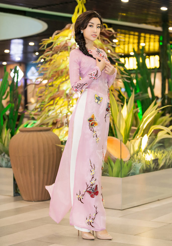 Nếu không phải Đỗ Mỹ Linh, chắc chẳng ai có thể diện chiếc áo dài thêu hoa, bướm này đẹp như thế. Hoa hậu Việt Nam 2016 khiến người đối diện không thể rời mắt với thần thái thanh tao, nhẹ nhàng. Người đẹp cũng lựa chọn kiểu tóc tết bím khá nữ tính để phù hợp với tổng thể.