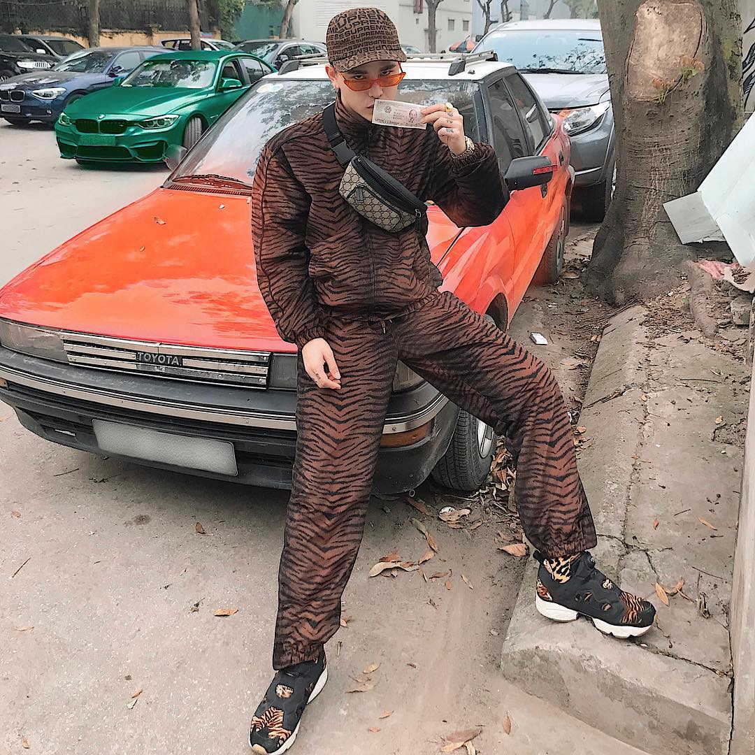 Nếu Châu Bùi đem đến outfit nhiều sắc màu thì Decao lại chọn lựa bộ cánh với cả cây áo và quần cùng chất liệu, họa tiết da động vật. Anh chàng cũng phối phụ kiện nón và túi đeo chéo cùng tông màu để giúp phần nhìn không bị “làm quá”.