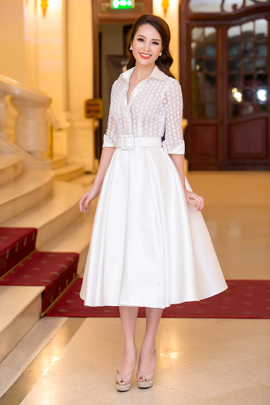 Tham dự sự kiện, á hậu Thụy Vân chọn cho mình chiếc váy xòe bồng của NTK Quân Phan nhằm đem lại hình ảnh tao nhã, thanh lịch. Phụ kiện cũng được tiết chế, chỉ cần một đôi hoa tai là đã đủ khiến cô “tỏa sáng”.