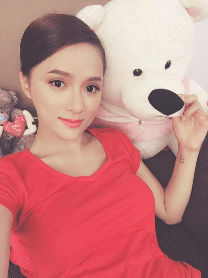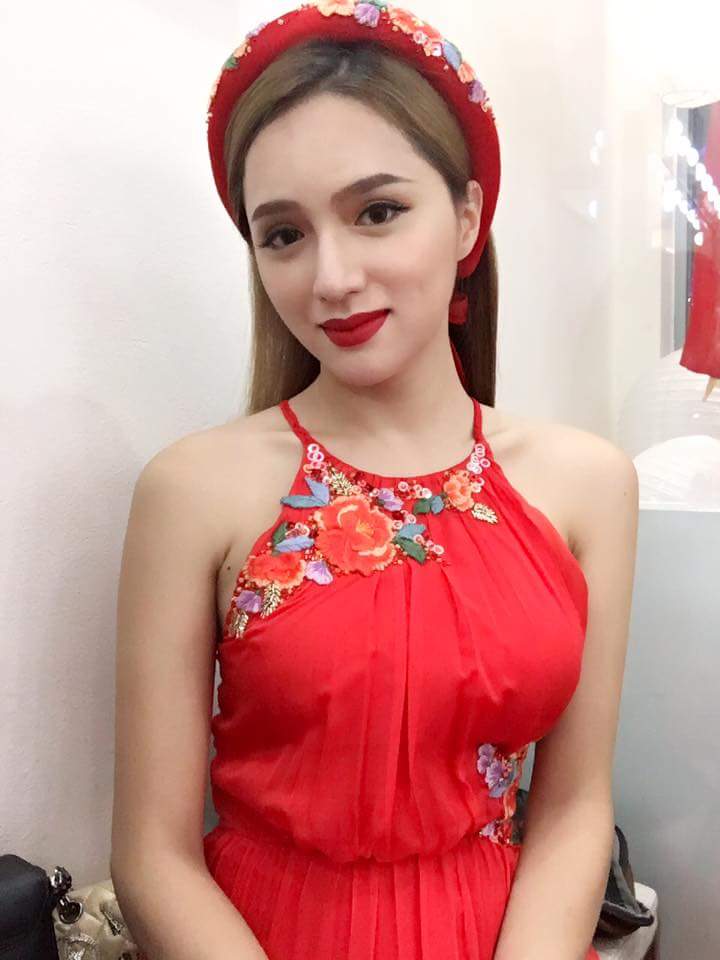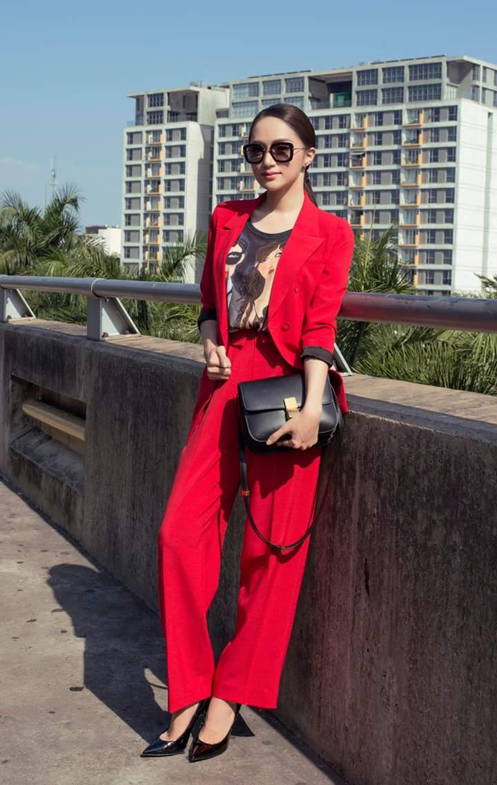 Cùng diện mẫu áo thun in logo Gucci được nhiều sao Việt yêu thích, Hương Giang lại chọn cho mình phiên bản màu đỏ để tạo dấu ấn riêng.