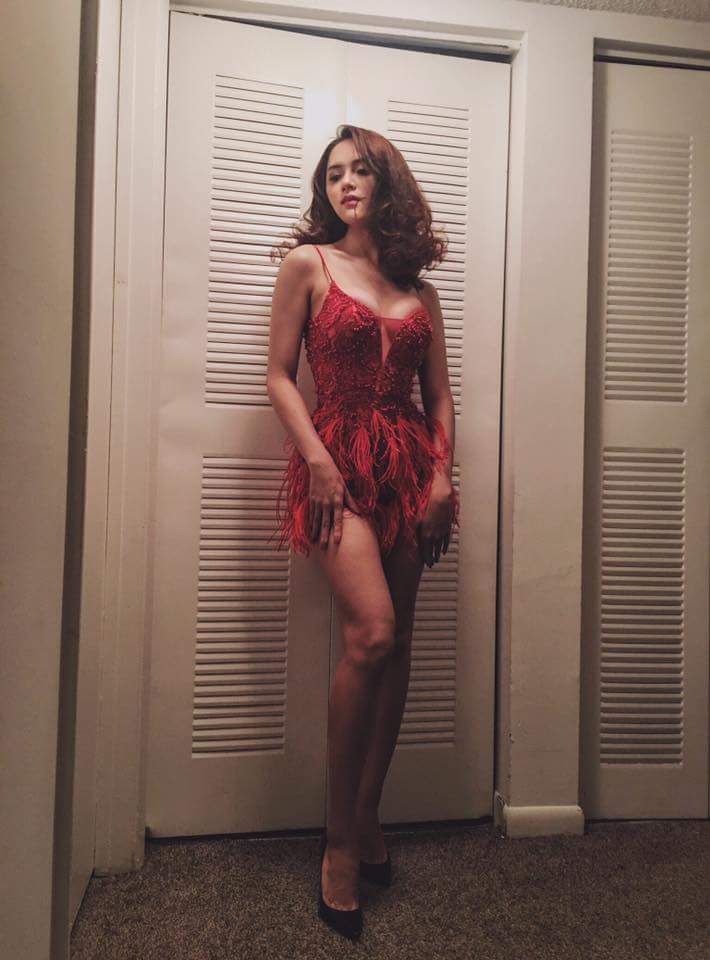 Ngoài ra, trang phục đi diễn của người đẹp sinh năm 1992 cũng không thiếu các kiểu váy áo hai dây, tông đỏ rực rỡ.