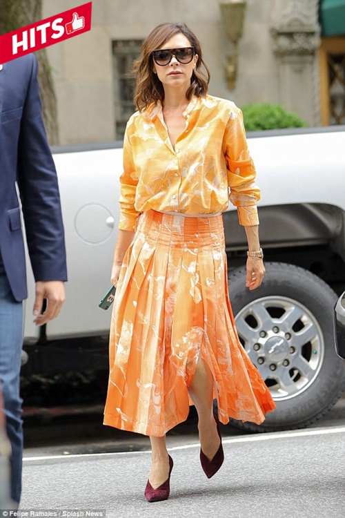 Không bao giờ sợ thử nghiệm những màu sắc mới, Victoria Beckham nổi bật với cả cây cam họa tiết in hoa sang trọng: áo sơ mi và chân váy midi. Cô chứng minh tuổi tác không là vấn đề cho những trang phục rực rỡ.