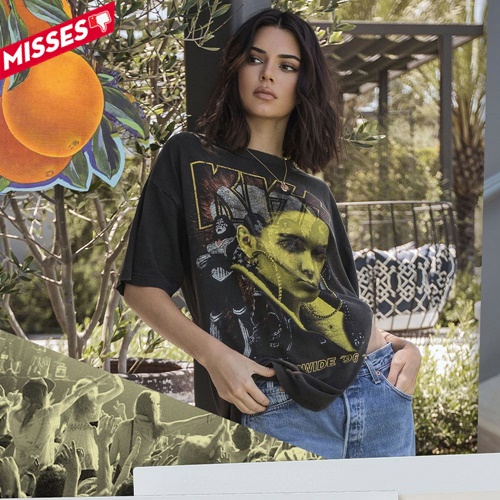 Kendall dù không mặc xấu nhưng cô bị liệt vào danh sách các sao xấu trong tuần vì tung ra bộ sưu tập những chiếc áo thun tự ý lấy hình của các biểu tượng âm nhạc đình đám như Tupac, Biggie và các nhóm nhạc rock như Metallica, Pink Floyd và The Doors. Chiếc áo cô mặc chính là bằng chứng cho việc làm sai trái đó khiến hình tượng thời trang của giới trẻ bỗng đổ bể trong tích tắc.