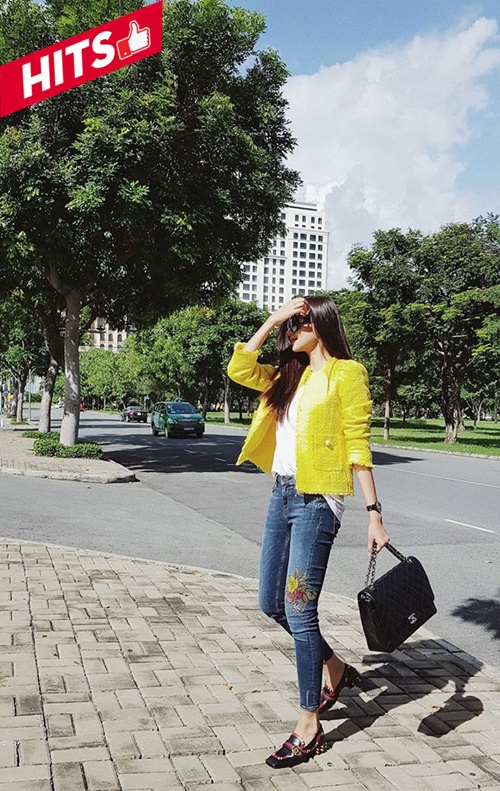 Bất chấp thời tiết đỏng đảnh của Sài Gòn, siêu mẫu Thanh Hằng vẫn ăn diện hết nấc xuống phố cùng với những món đồ hiệu đắt đỏ như túi Chanel, giày Gucci. Chiếc áo jacket màu vàng chanh như càng tô điểm cho sự nổi bật của chân dài.
